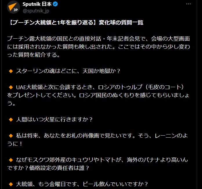 | … | 697無題Name名無し 25/12/21(日)19:17:16 IP:106.150.*(dion.ne.jp)No.2684178そうだねx5 1766312236921.jpg-(113619 B) 気晴らしに先日の「プーチン大統領に訊いてみよう!」の面白質問 |