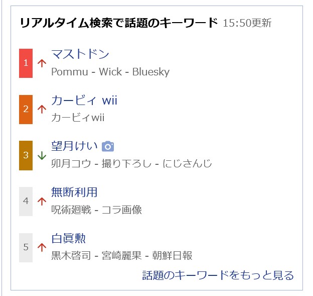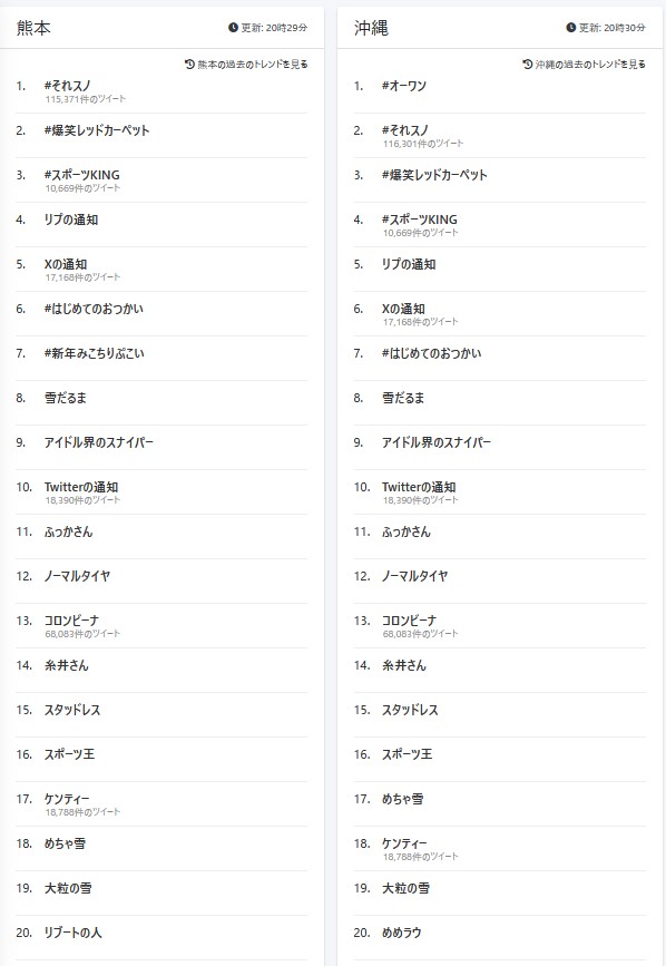 | … | 965無題Name名無し 26/01/02(金)21:56:22 IP:14.3.*(asahi-net.or.jp)No.2686069+たまにニュースに出てくる雪国から雪を南国に送って子供たちがはしゃぐって話題はあるけどそういう事でトレンド入りはしないか |