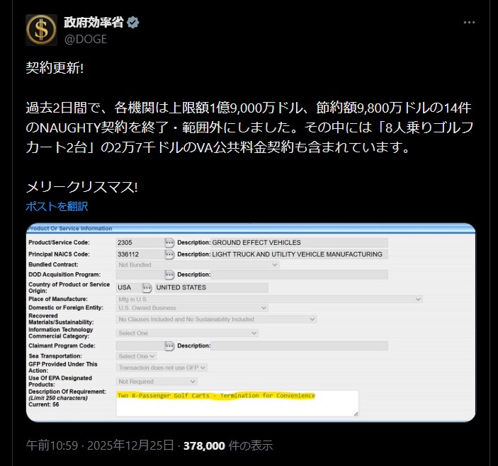 | … | 78無題Name名無し 25/12/25(木)06:49:18 IP:106.150.*(dion.ne.jp)No.2684848そうだねx1 1766612958707.png-(702180 B) 会計検査院がDOGE的な動きを始める |