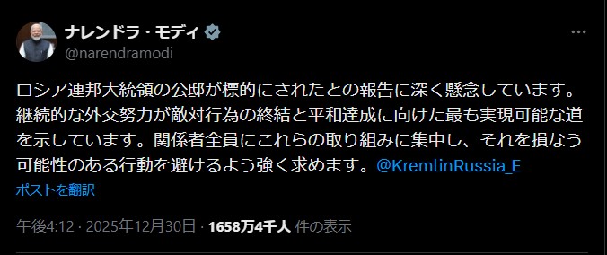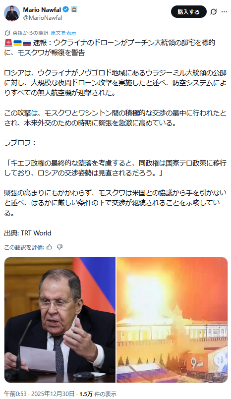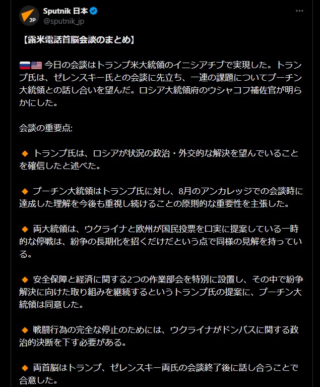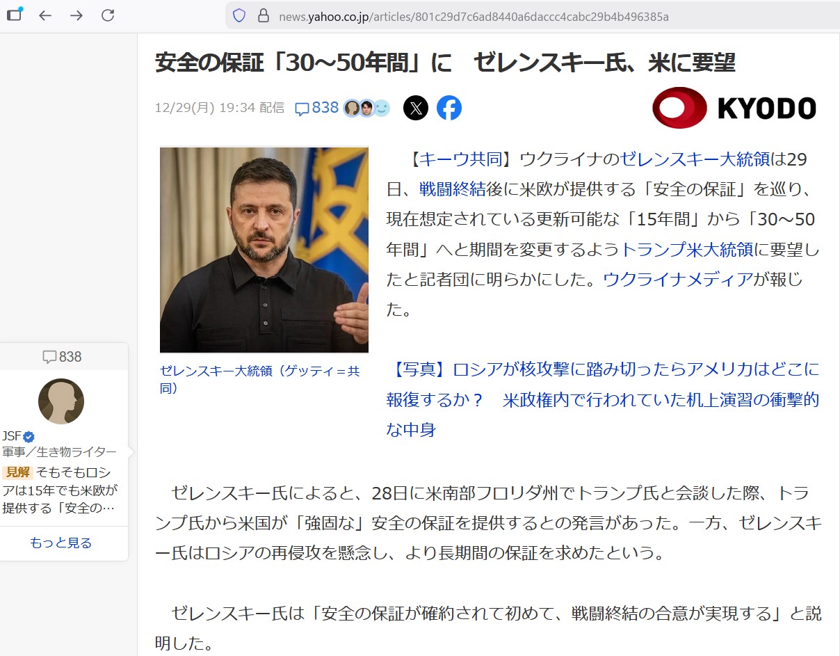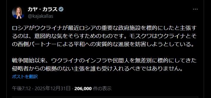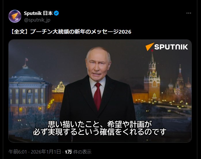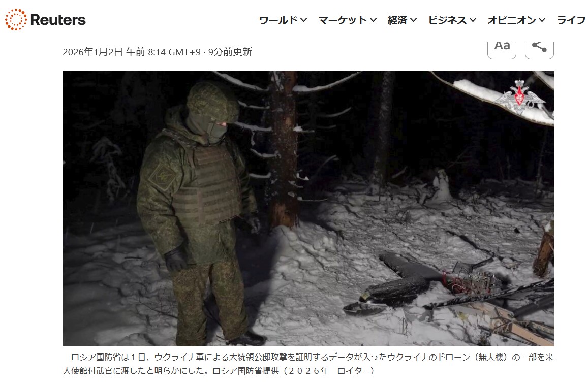 | … | 925無題Name名無し 26/01/02(金)08:28:31 IP:14.13.*(enabler.ne.jp)No.2685964そうだねx5 1767310111009.jpg-(159171 B) ロシア、ウクライナ攻撃の証拠を米に提供 プーチン氏公邸攻撃未遂(抜粋) |