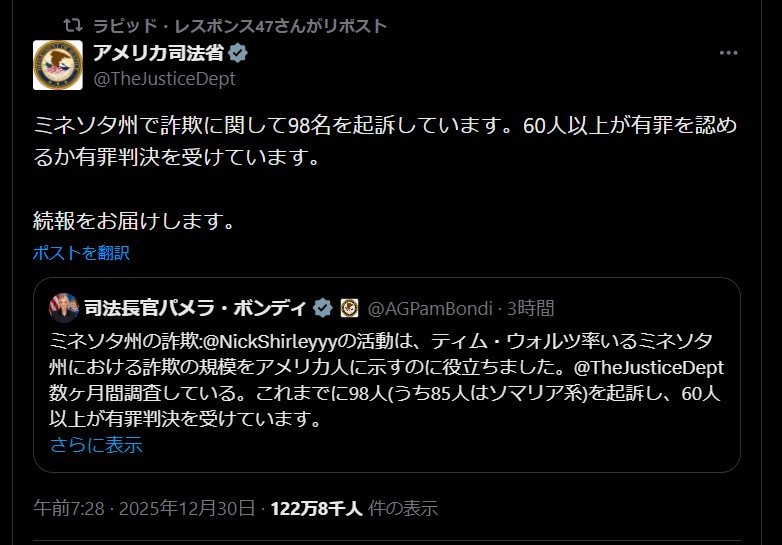 | … | 85無題Name名無し 25/12/25(木)07:09:15 IP:106.150.*(dion.ne.jp)No.2684855そうだねx13 1766614155550.png-(540043 B) エプスタイン捜査に関連し得る文書100万件を精査中−米司法省 |