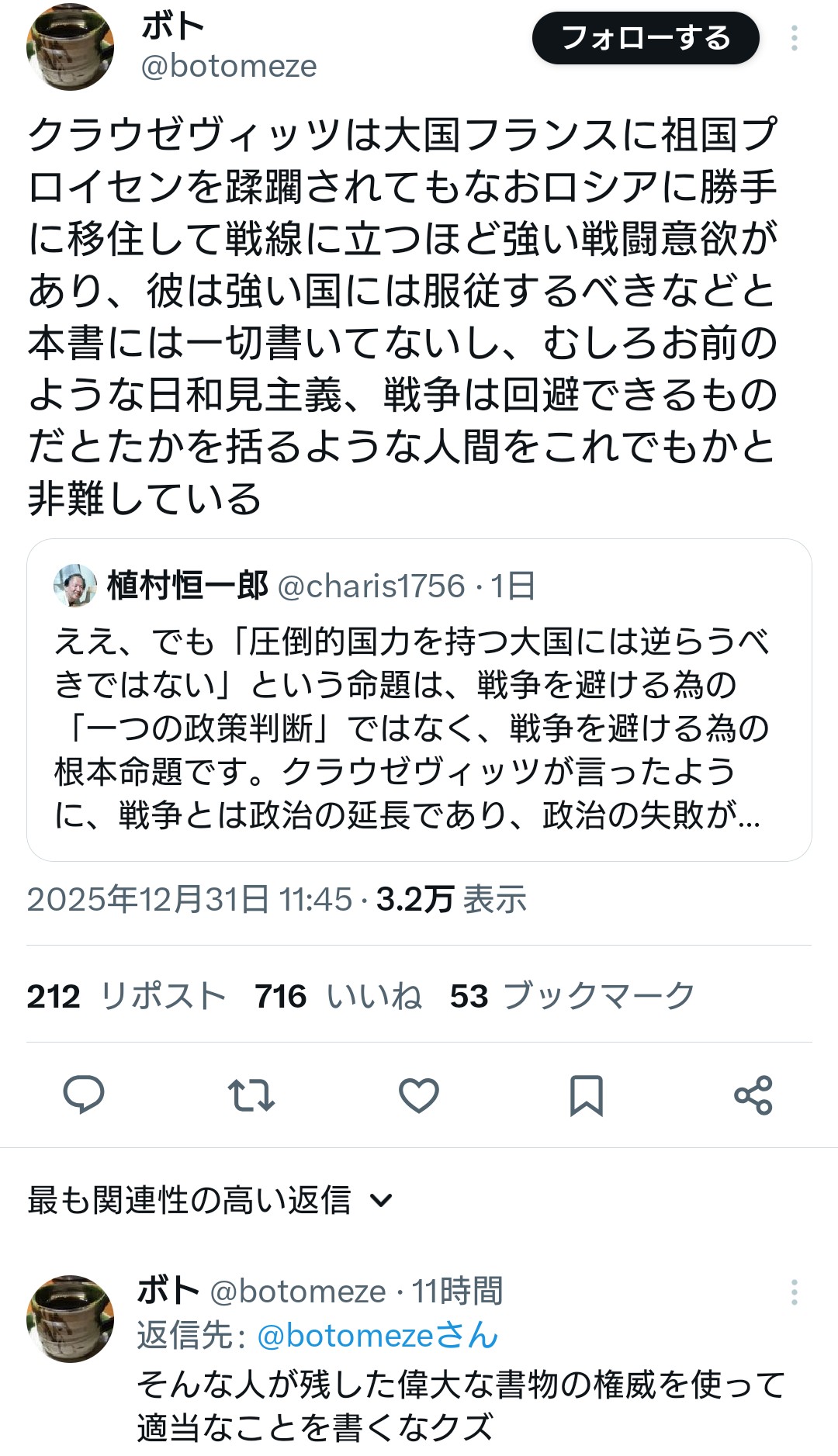 | … | 878無題Name名無し 26/01/01(木)13:46:48 IP:202.70.*(oninet.ne.jp)No.2685890そうだねx15ゼレちんと違ってクラウゼヴィッツもフリードリッヒ大王も他国からの支援のみをあてにして戦ってたわけじゃねーよ |
