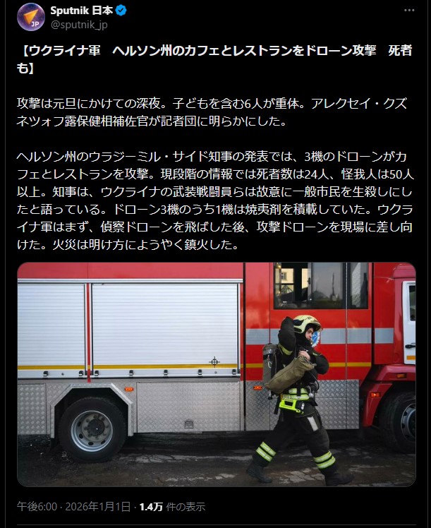 | … | 958無題Name名無し 26/01/02(金)19:43:42 IP:106.150.*(dion.ne.jp)No.2686062+ 1767350622674.png-(2136849 B) >(new)1/1ロシアのヘルソン州知事はカフェにウクライナ軍ドローンが攻撃し死者24名負傷者50名以上と発表 |