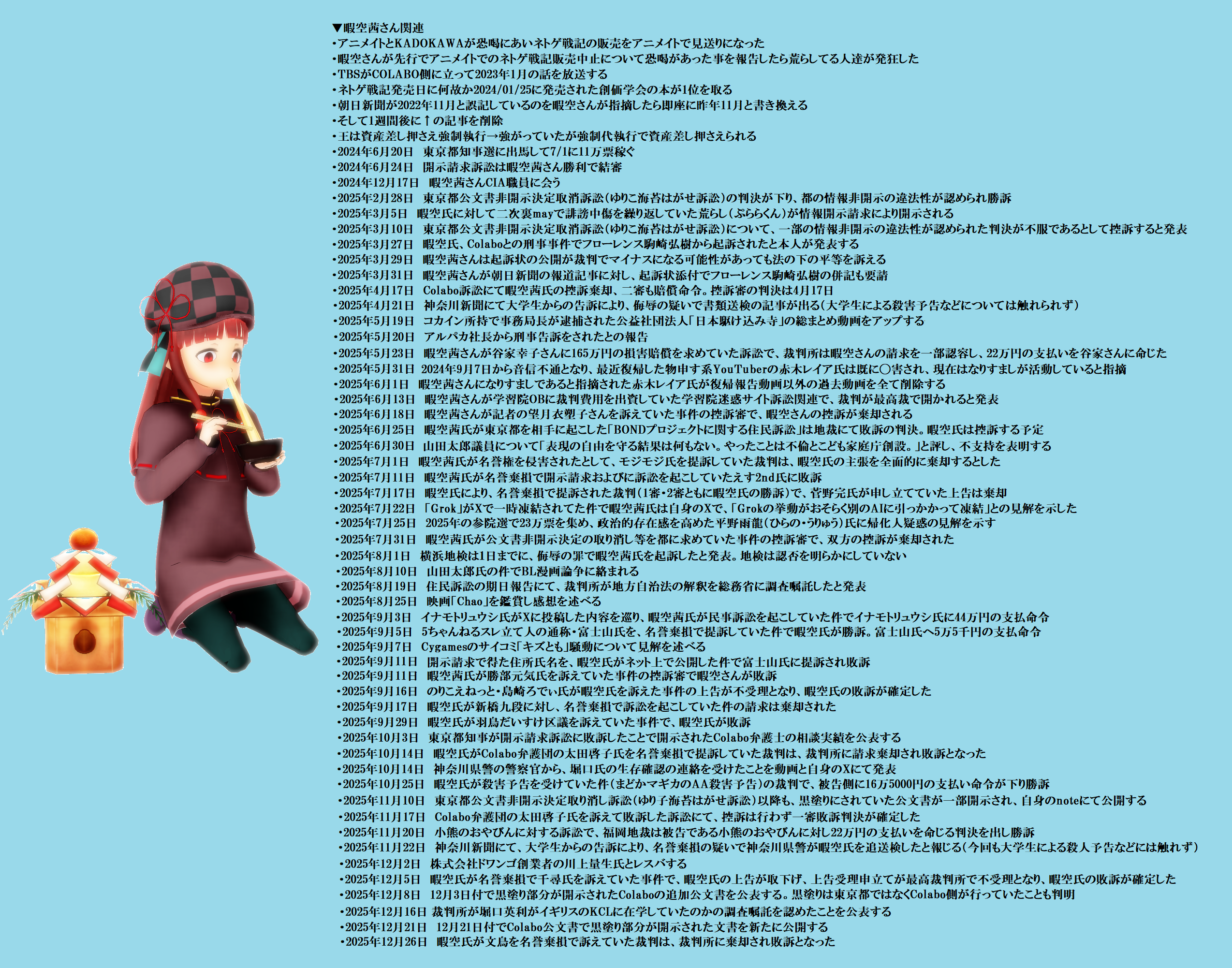 | … | 15無題Name名無し 26/01/03(土)12:08:49 IP:175.177.*(itscom.jp)No.2686125+ 1767409729839.jpg-(2801381 B) ★2025年7月〜8月の出来事まとめ |