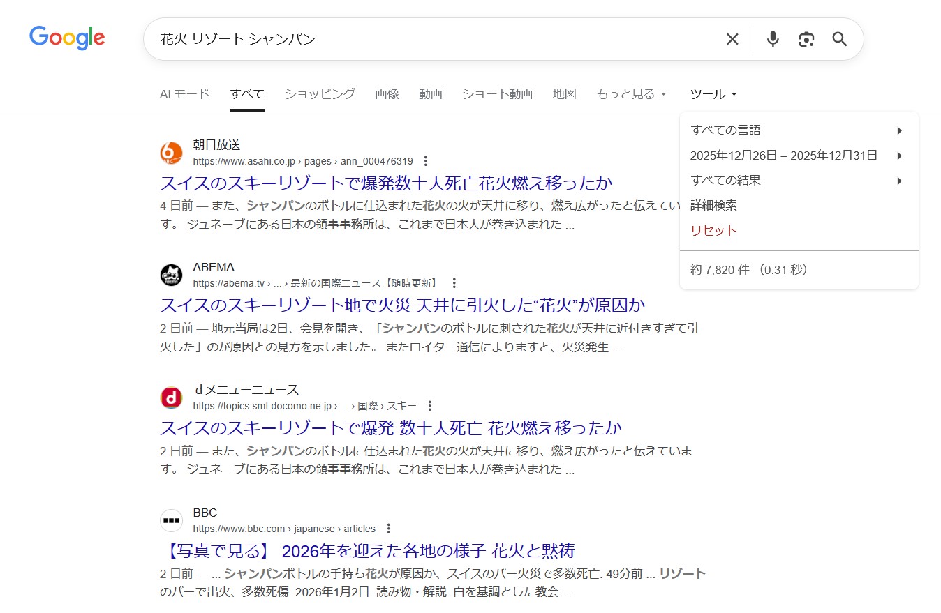 | … | 47無題Name名無し 26/01/03(土)15:41:54 IP:106.150.*(dion.ne.jp)No.2686157そうだねx4 1767422514394.jpg-(191291 B) スイスのカフェ爆発事件、今日になって出火原因はシャンパン瓶に入れた花火からの延焼と報じられております |