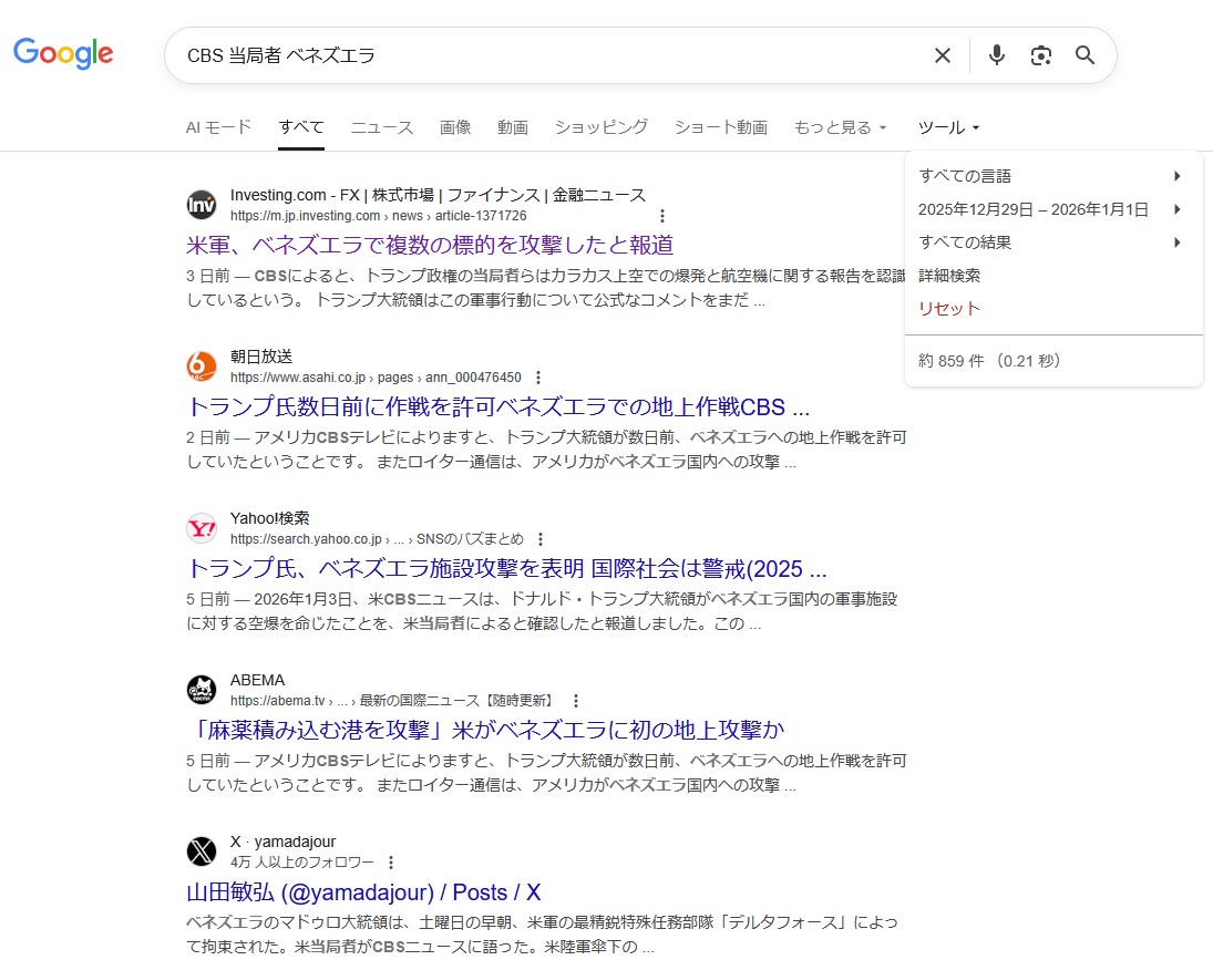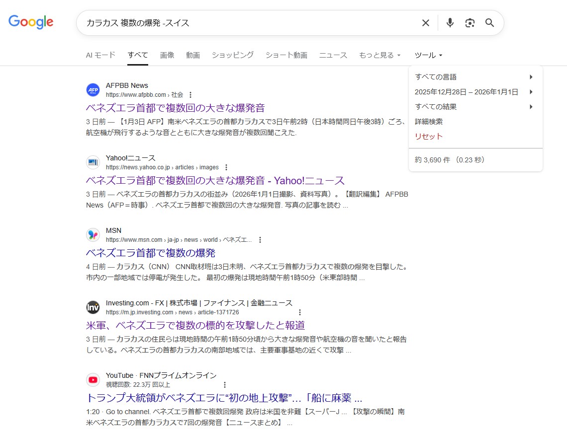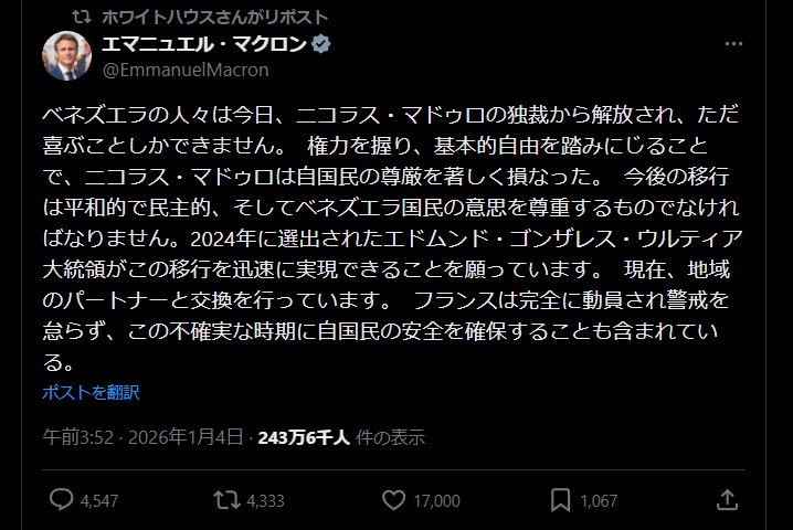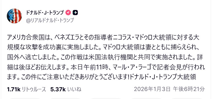 | … | 56無題Name名無し 26/01/03(土)17:39:29 IP:217.178.*(transix.jp)No.2686169+ベネズエラ政府が米攻撃と声明 |