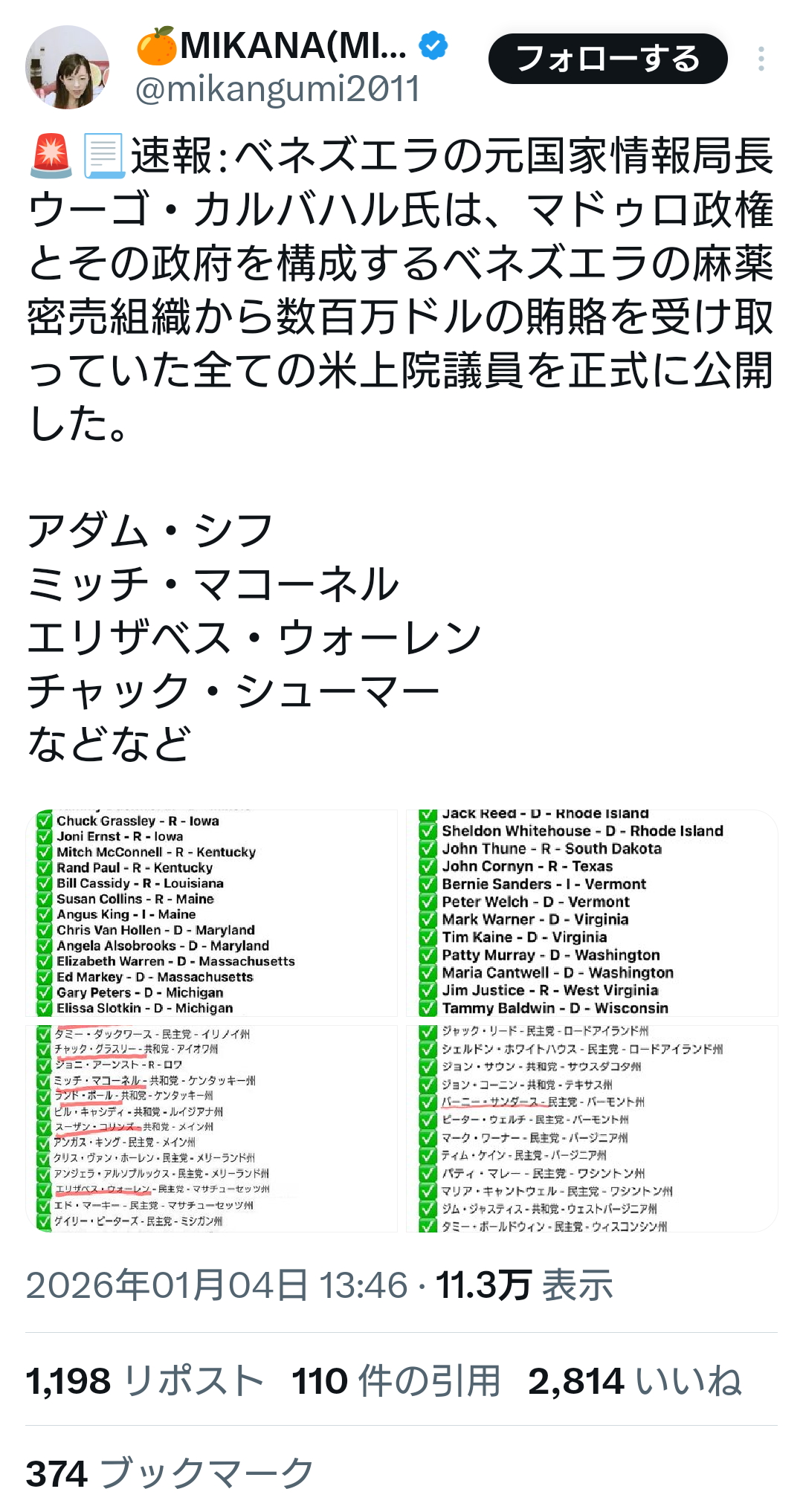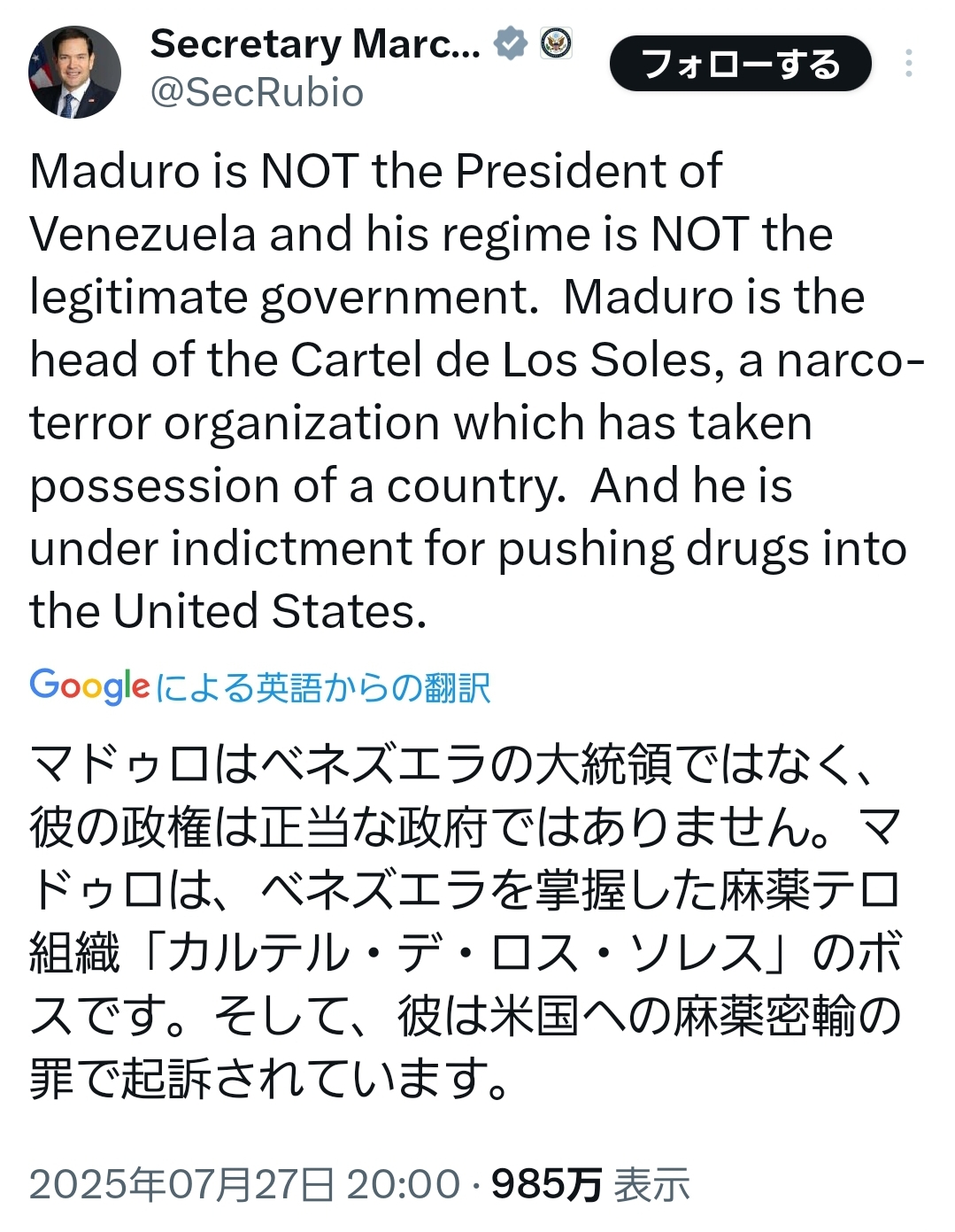 | … | 55無題Name名無し 26/01/03(土)17:14:51 IP:125.193.*(mesh.ad.jp)No.2686166そうだねx2アメリカはベネズエラ大統領とカルテルが共謀してると考えてるみたい |