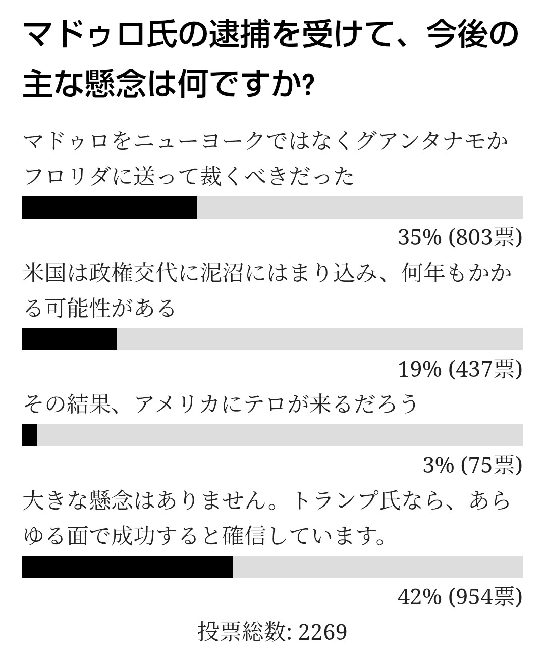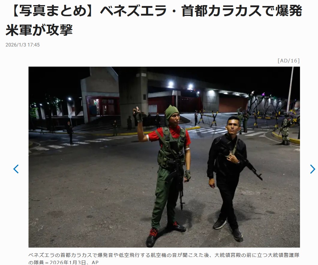 | … | 589無題Name名無し 26/01/06(火)22:49:05 IP:150.249.*(nuro.jp)No.2687004そうだねx2 1767707345188.jpg-(172933 B) >ベネズエラ軍事作戦、支持3割 多数が過度な関与懸念=調査 |