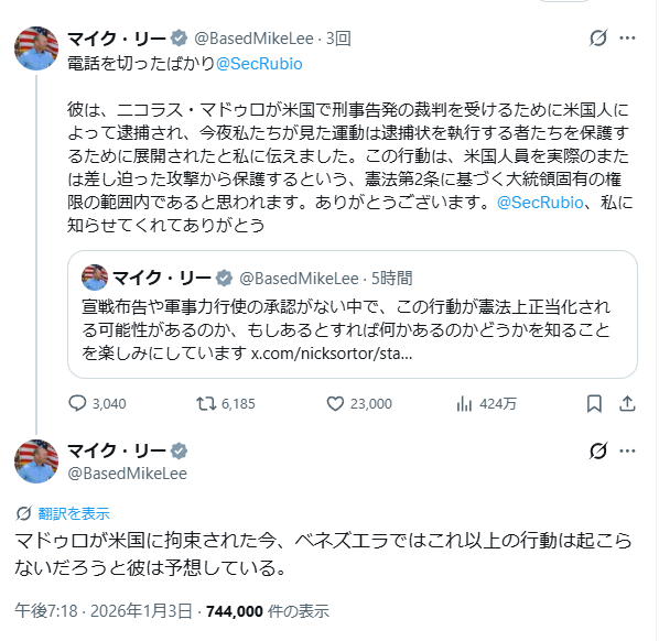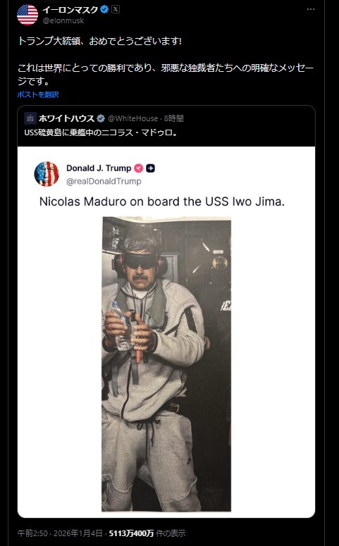 | … | 60無題Name名無し 26/01/03(土)18:34:50 IP:60.68.*(bbtec.net)No.2686174そうだねx12ベネズエラのマドゥロ大統領拘束したみたいね |