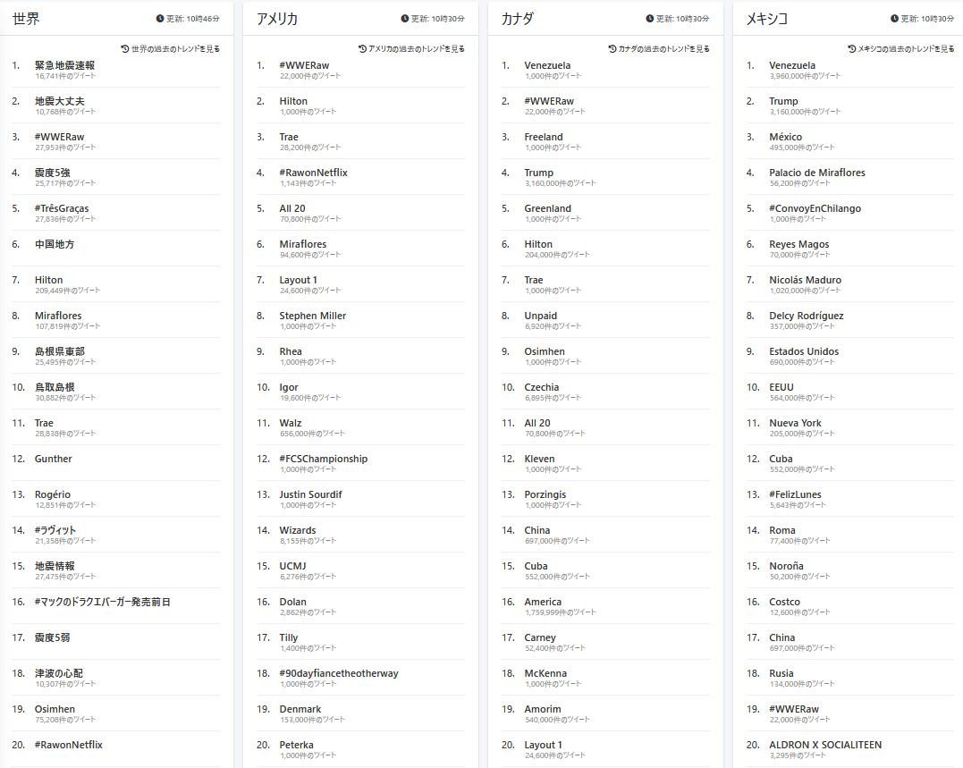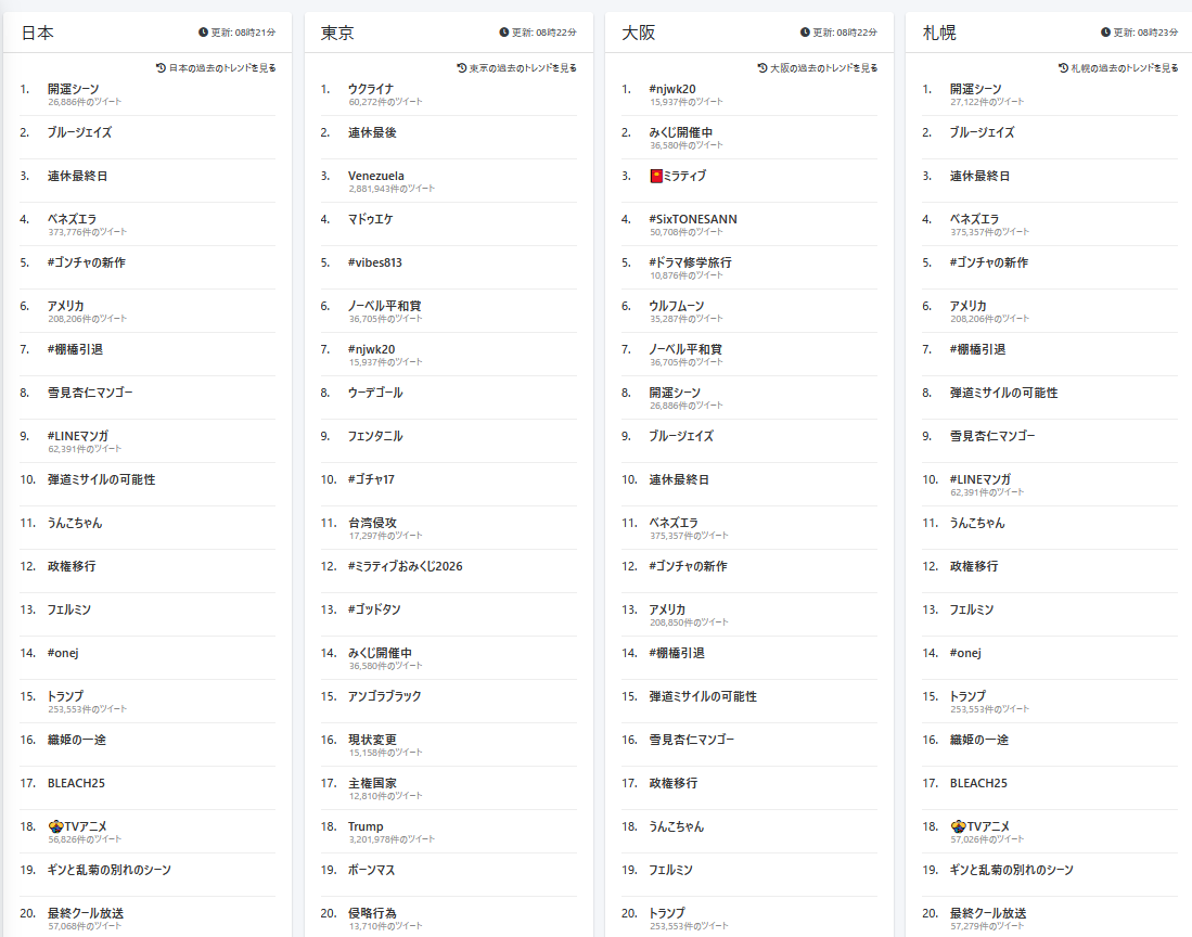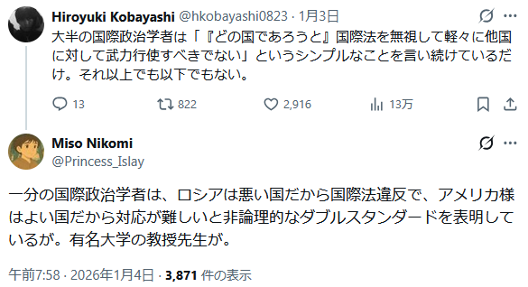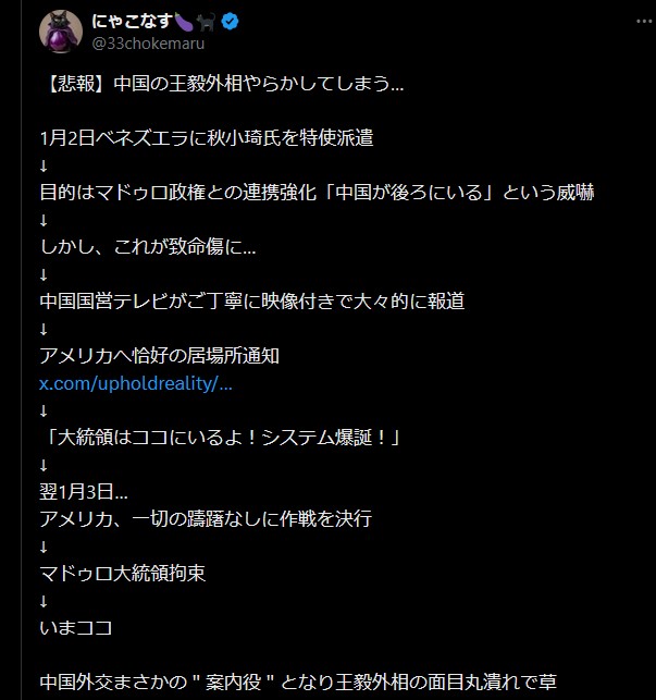 | … | 53無題Name名無し 26/01/03(土)16:55:32 IP:124.212.*(dion.ne.jp)No.2686163+ベネズエラってどういう状況だったっけXはここぞとばかりにトランプガー乱舞してて参考にならん |