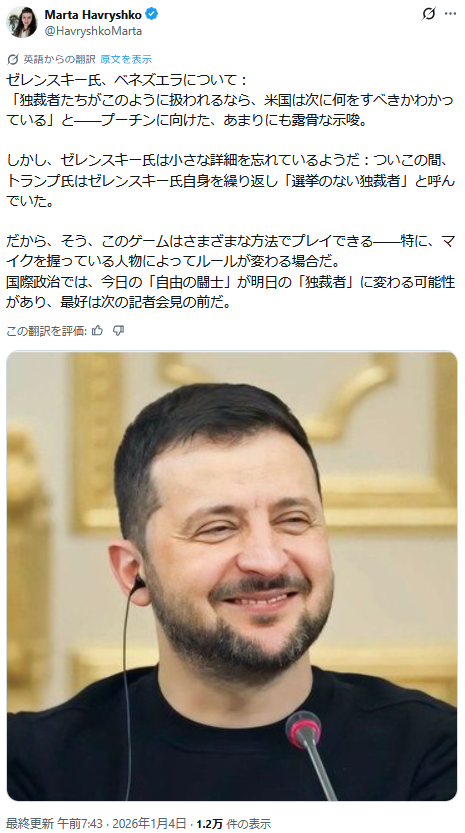 | … | 85無題Name名無し 26/01/03(土)19:41:10 IP:106.150.*(dion.ne.jp)No.2686199そうだねx2 1767436870534.jpg-(39280 B) 4日午前1時から記者会見とトランプ氏 共同 |