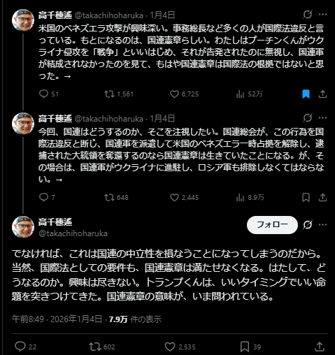 | … | 648無題Name名無し 26/01/07(水)11:36:47 IP:153.144.*(plala.or.jp)No.2687072+モーニングショーではベネズエラ攻撃は力による現状変更だからダメ |
