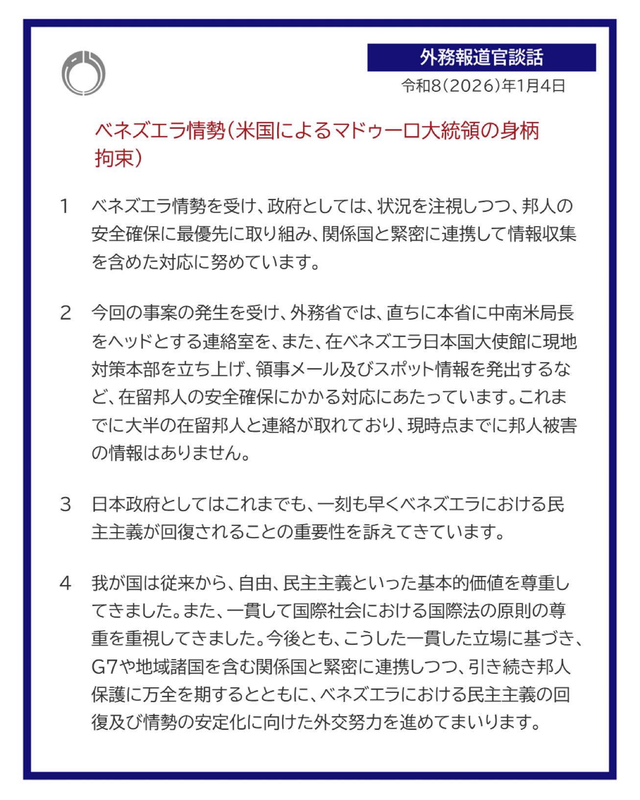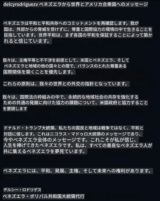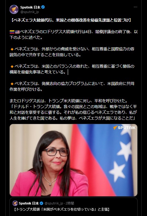 | … | 88無題Name名無し 26/01/03(土)19:54:35 IP:106.150.*(dion.ne.jp)No.2686202そうだねx9 1767437675564.jpg-(119019 B) ベネズエラが「米国の軍事的侵略を拒否」の声明 米メディアが報道 |