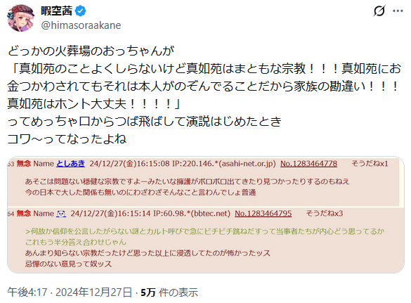 | … | 583無題Name名無し 26/01/06(火)22:02:56 IP:122.21.*(ocn.ne.jp)No.2686998そうだねx12宗教関係者との深い関わりはない(祭事全部断る・ご霊前や寄付一切なし)まで言い切って初めてクリーンと言えるんだけども… |