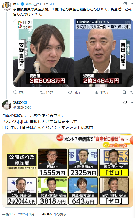 | … | 575無題Name名無し 26/01/06(火)21:25:31 IP:153.137.*(ocn.ne.jp)No.2686990そうだねx4 1767702331202.png-(506095 B) 議員の資産公開だにょ |