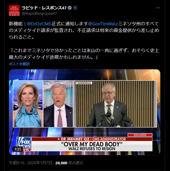 | … | 629無題Name名無し 26/01/07(水)09:44:01 IP:106.150.*(dion.ne.jp)No.2687051そうだねx4 1767746641309.jpg-(135029 B) ミネソタのメディケイド請求を全部監査だってよ |