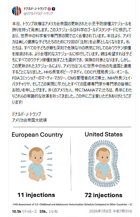 | … | 633無題Name名無し 26/01/07(水)09:59:28 IP:106.150.*(dion.ne.jp)No.2687055そうだねx1 1767747568029.png-(199420 B) アメリカの子供へのワクチン接種を一気に減らすと発表 |