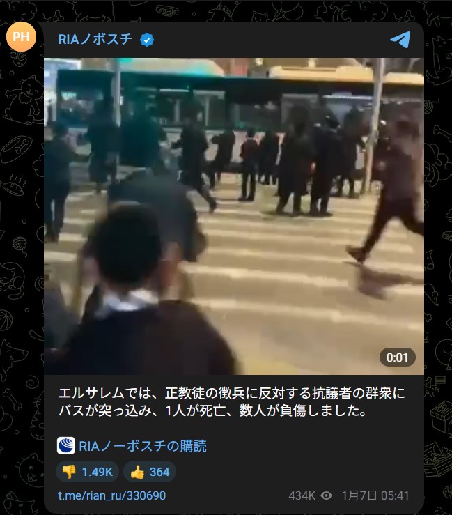 | … | 663無題Name名無し 26/01/07(水)15:10:38 IP:106.150.*(dion.ne.jp)No.2687087+ 1767766238106.jpg-(96416 B) エルサレムでは、徴兵反対の集会でバスが正統派の男性をはねて死亡させました(ロシア語・動画あり) |