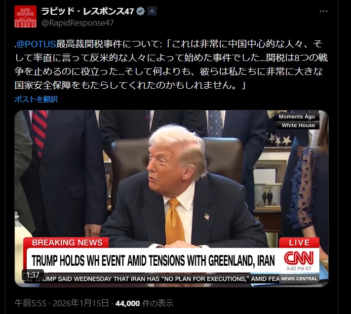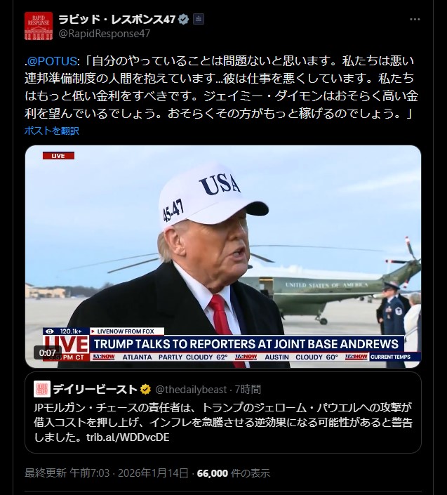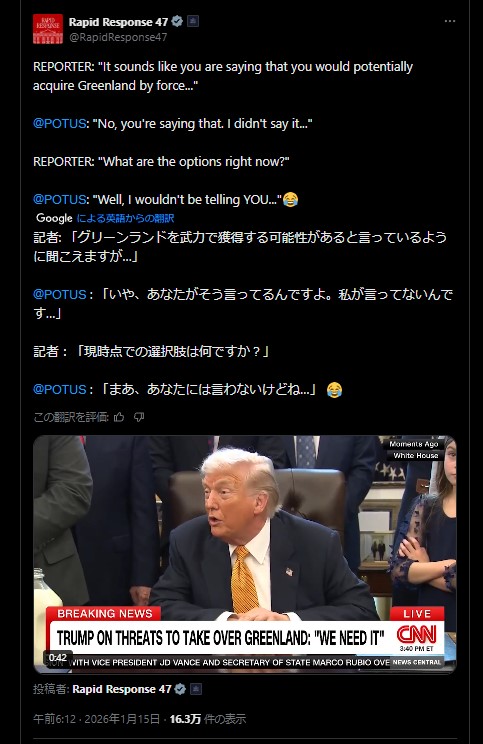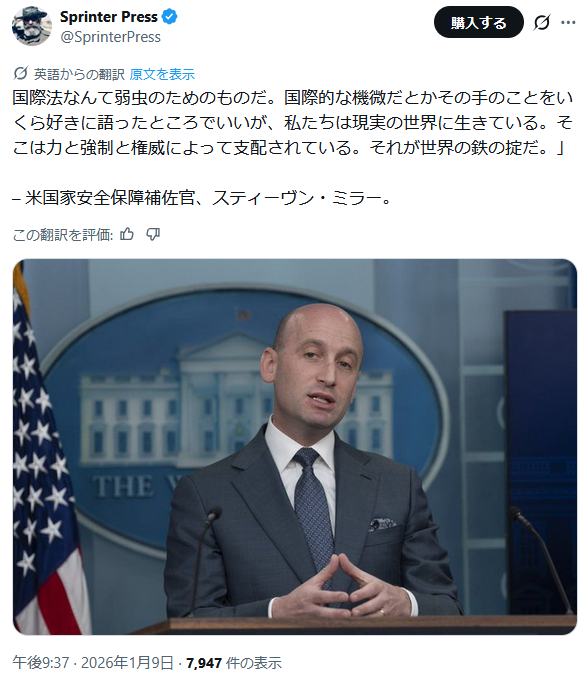 | … | 41無題Name名無し 26/01/10(土)13:42:57 IP:153.137.*(ocn.ne.jp)No.2687834そうだねx5 1768020177128.png-(291839 B) >「力による現状変更は許さない」はこのより大きな政府が認めない限り国家が自由に暴力を振るってはいけないってことね |