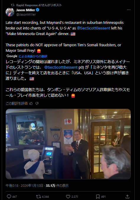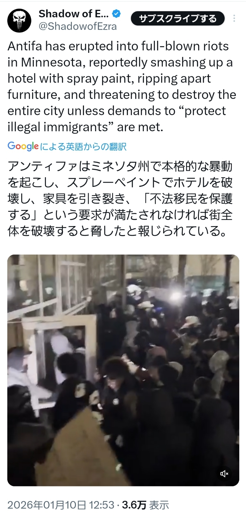 | … | 86無題Name名無し 26/01/10(土)18:21:42 IP:1.73.*(spmode.ne.jp)No.2687883そうだねx5 1768036902909.jpg-(570808 B) 何故かアンティファが不法移民保護しろと騒いでるらしい |