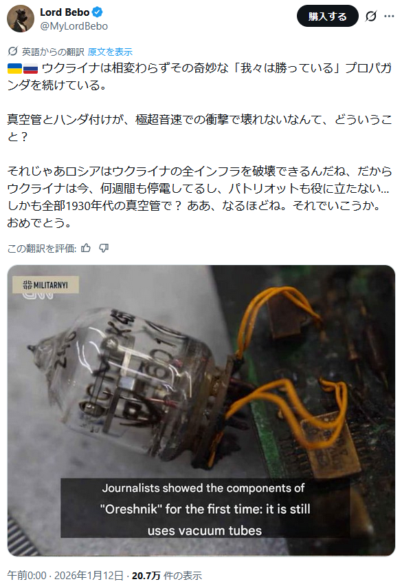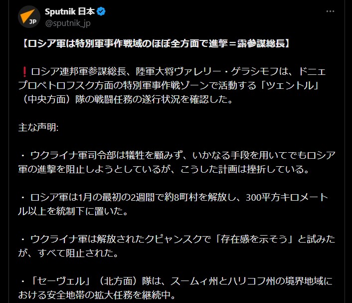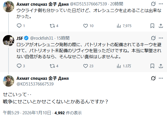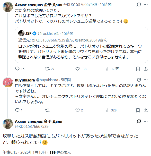 | … | 1無題Name名無し 26/01/10(土)12:09:50 IP:175.177.*(itscom.jp)No.2687786+▼ウクライナ情報に関するテンプレ |