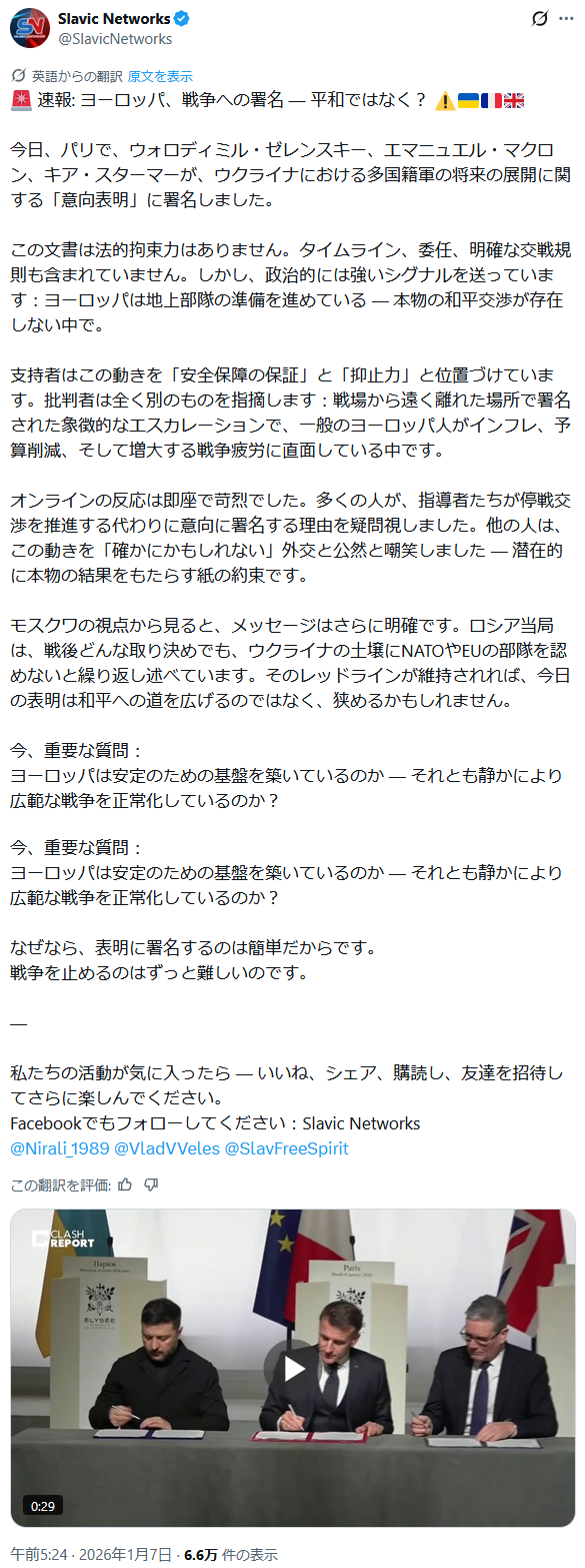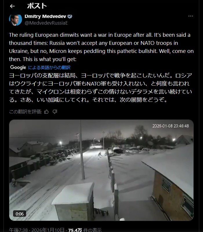 | … | 84無題Name名無し 26/01/10(土)17:43:10 IP:112.69.*(eonet.ne.jp)No.2687881そうだねx7>【欧州もロシアと対話するときがきた=メローニ伊首相】 |