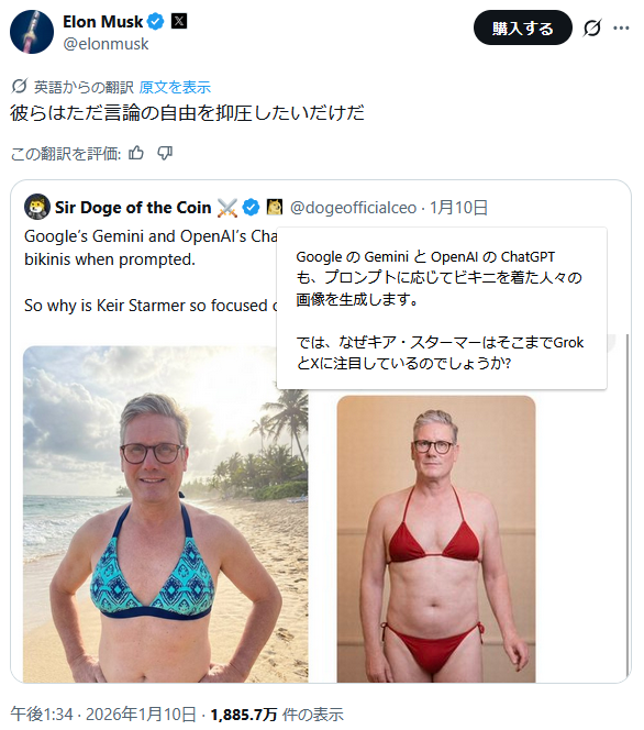 | … | 977無題Name名無し 26/01/15(木)20:41:37 IP:106.150.*(dion.ne.jp)No.2689187そうだねx5 1768477297238.png-(644632 B) X投稿で性的画像へのAI加工不能に 対応策発表、マスク氏「悪用認識していなかった」 |