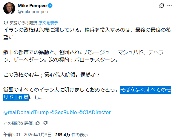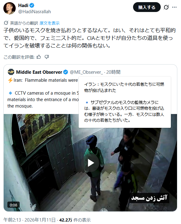 | … | 43無題Name名無し 26/01/10(土)13:52:59 IP:125.193.*(mesh.ad.jp)No.2687836そうだねx3今のイラン見てシオニストはしゃいでそうだな〜 って… |