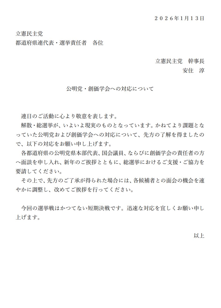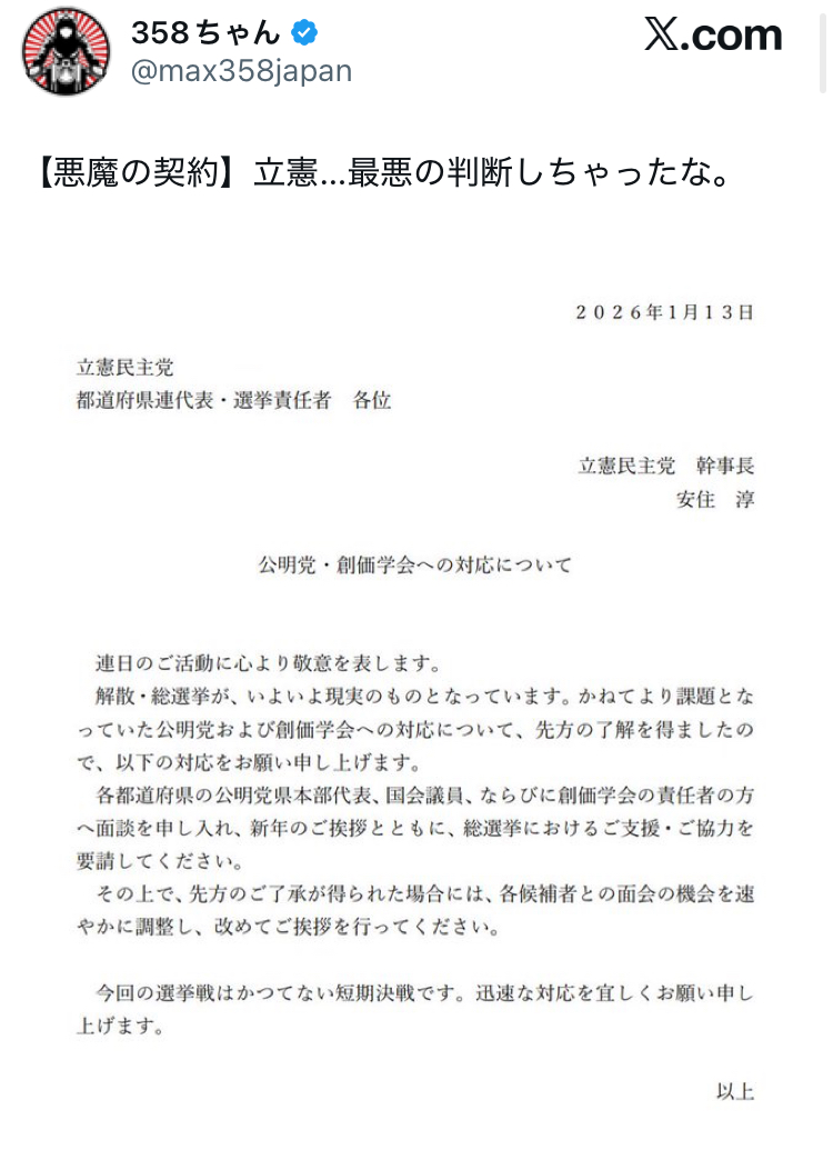 | … | 978無題Name名無し 26/01/15(木)20:46:12 IP:106.150.*(dion.ne.jp)No.2689188そうだねx1 1768477572292.jpg-(53902 B) 公明・斉藤代表「小選挙区には公明出身者は擁立しない」「第二新進党を目指すものではない」(抜粋) |