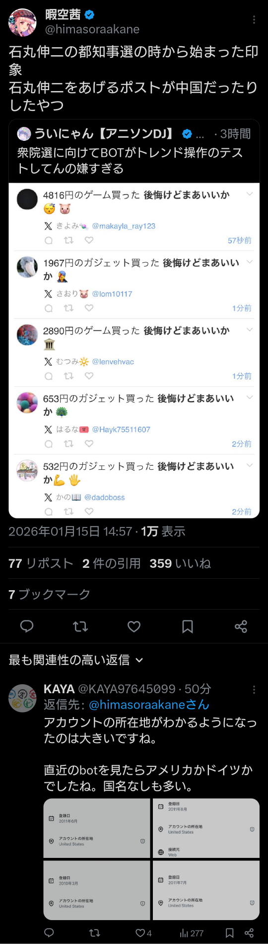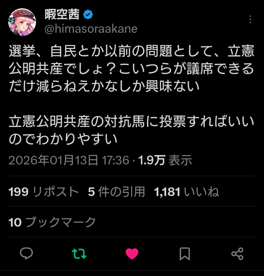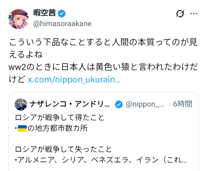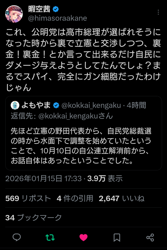 | … | 918無題Name名無し 26/01/15(木)17:55:54 IP:182.249.*(au-net.ne.jp)No.2689116そうだねx18 1768467354379.png-(126132 B) https://x.com/himasoraakane/status/2011702945629552786 |