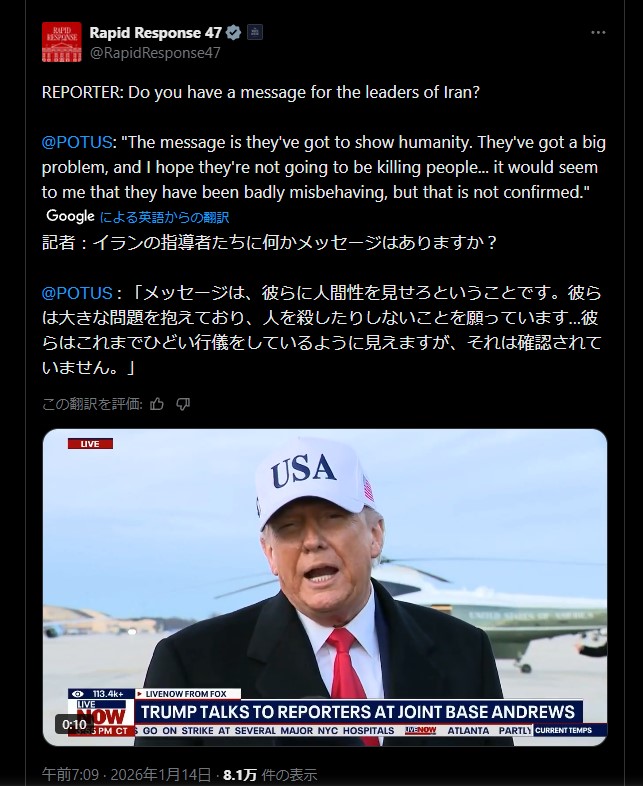 | … | 48無題Name名無し 26/01/10(土)14:06:59 IP:125.193.*(mesh.ad.jp)No.2687841+イランは超絶通貨安で経済がボロボロらしいね |