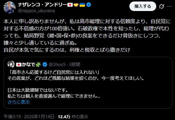 | … | 943無題Name名無し 26/01/15(木)19:03:28 IP:153.240.*(ocn.ne.jp)No.2689147そうだねx13ニュース見てたら自民党は本格的に公明党と手を切れそうね |