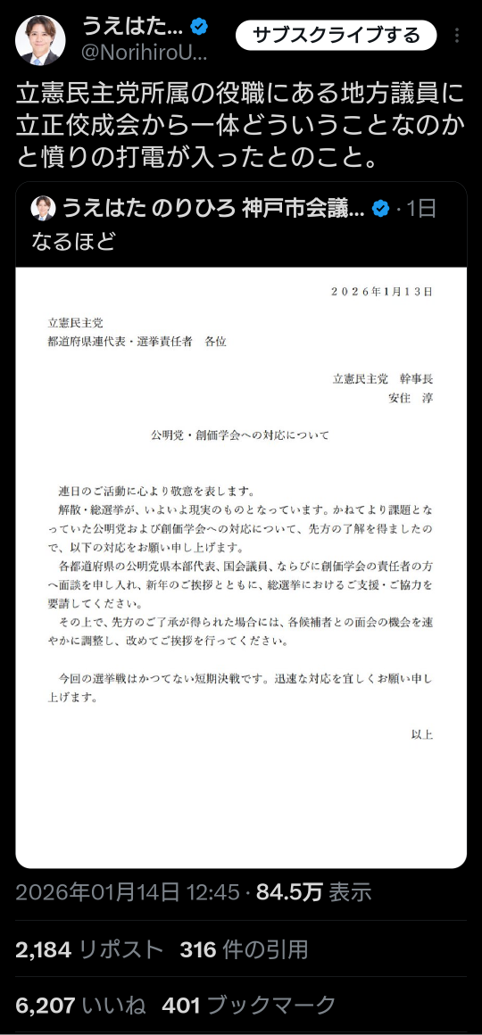 | … | 967無題Name名無し 26/01/15(木)20:21:29 IP:150.249.*(nuro.jp)No.2689177そうだねx1>>斉藤代表「集まった人は、もう立憲の人じゃないんです。公明党が掲げた五つの旗の下に集まって来た人です。立憲民主党の人ではありません!」 |