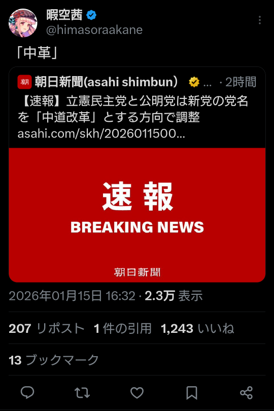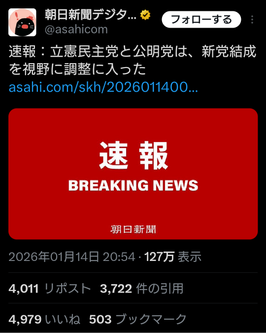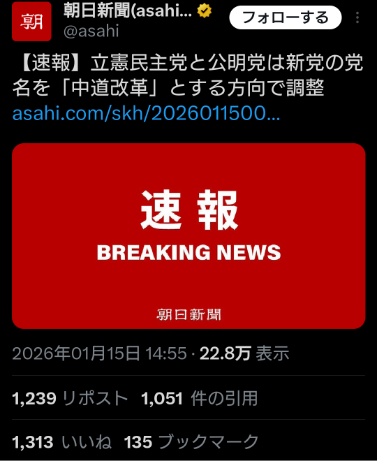 | … | 974無題Name名無し 26/01/15(木)20:31:32 IP:106.150.*(dion.ne.jp)No.2689184そうだねx9 1768476692138.png-(1445137 B) 中国メディア、立民・公明新党合意を速報 高市氏の対抗軸期待か |