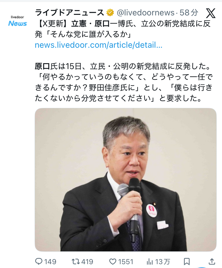 | … | 955無題Name名無し 26/01/15(木)19:30:13 IP:106.150.*(dion.ne.jp)No.2689162+ 1768473013010.png-(837822 B) >立憲民主党の原口一博衆院議員 |