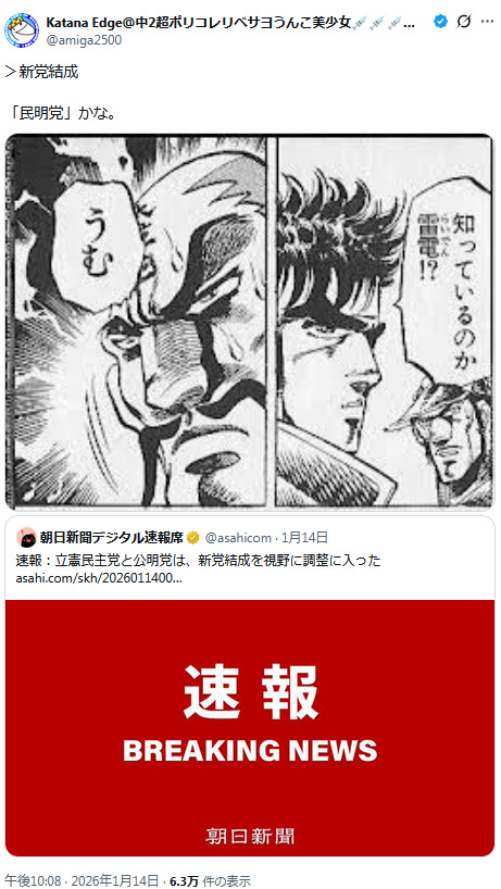 | … | 991無題Name名無し 26/01/15(木)22:15:53 IP:14.12.*(enabler.ne.jp)No.2689202+民主に公明が併合じゃなくて公明に民主が併合…? |