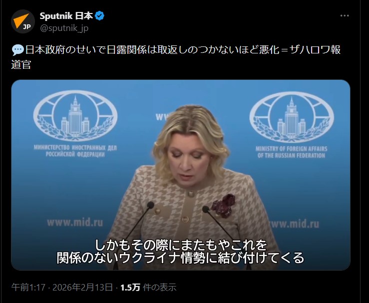 | … | 88無題Name名無し 26/02/13(金)04:49:17 IP:106.150.*(dion.ne.jp)No.2697384そうだねx11 1770925757029.jpg-(81488 B) 日本政府のせいで日露関係は取返しのつかないほど悪化=ザハロワ報道官(動画) |