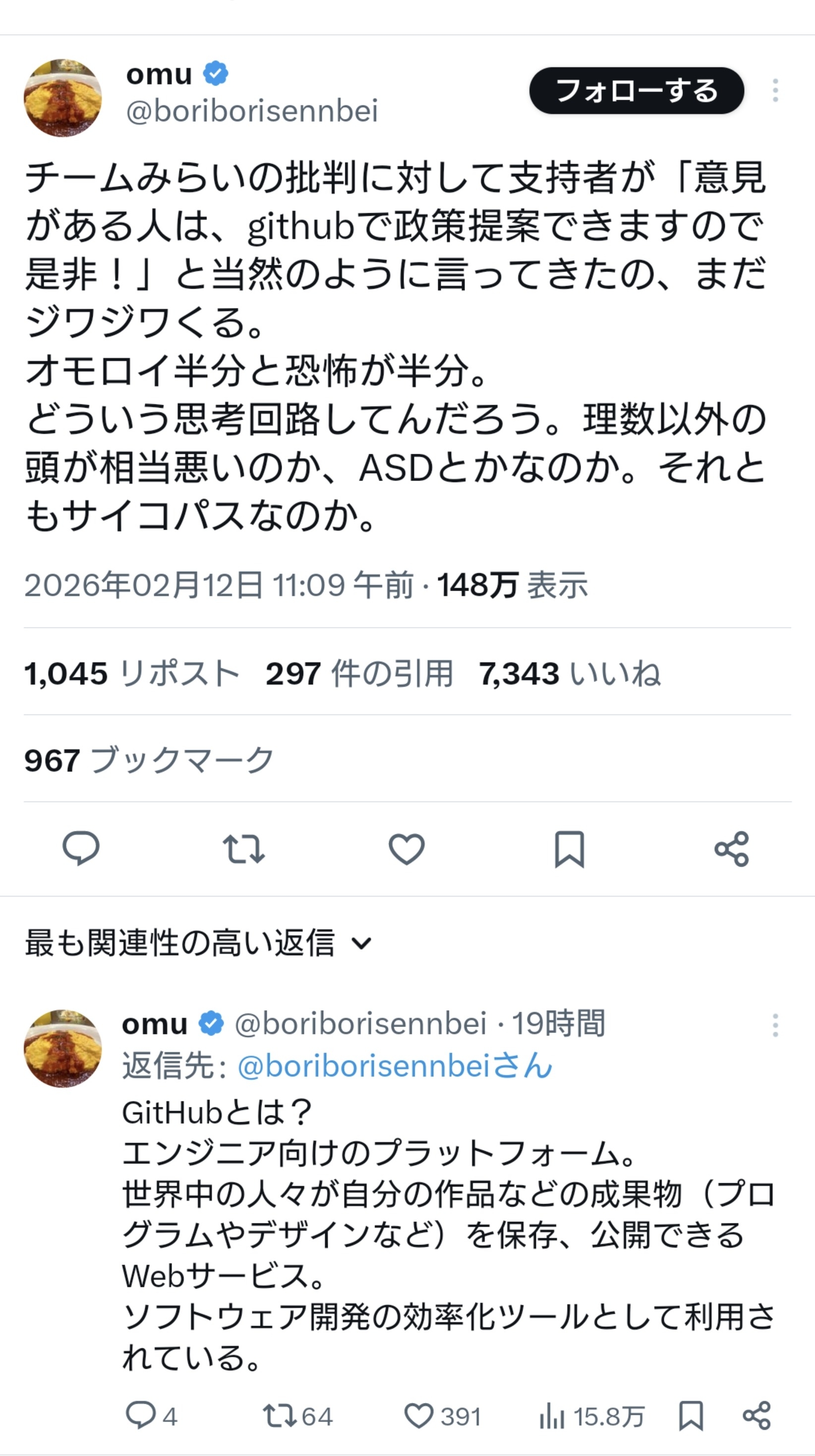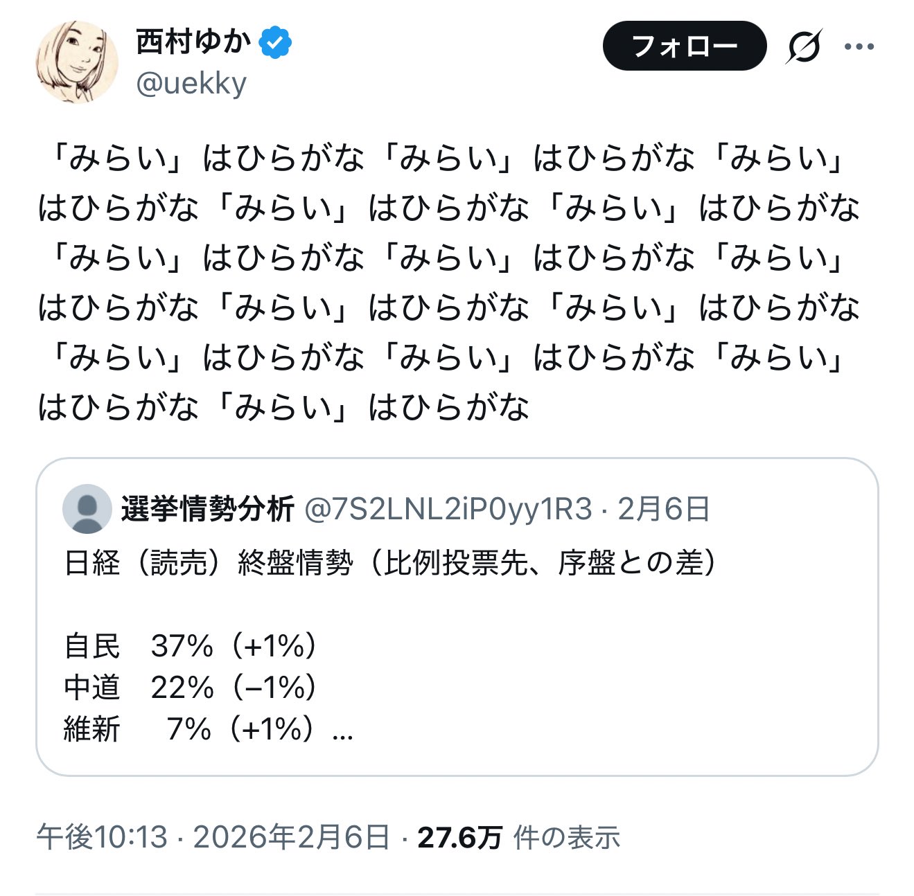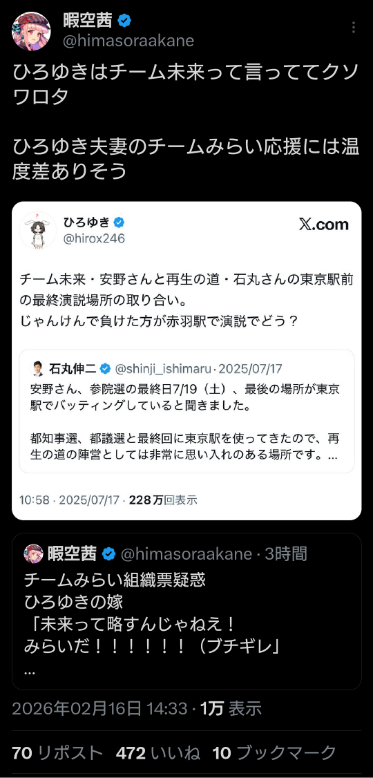 | … | 970無題Name名無し 26/02/17(火)15:45:02 IP:182.249.*(au-net.ne.jp)No.2698739そうだねx6https://x.com/team_mirai_jp/status/2023622880408551811 |