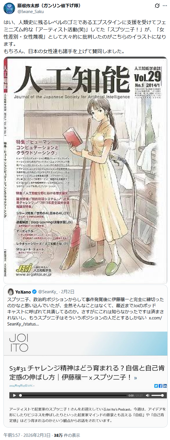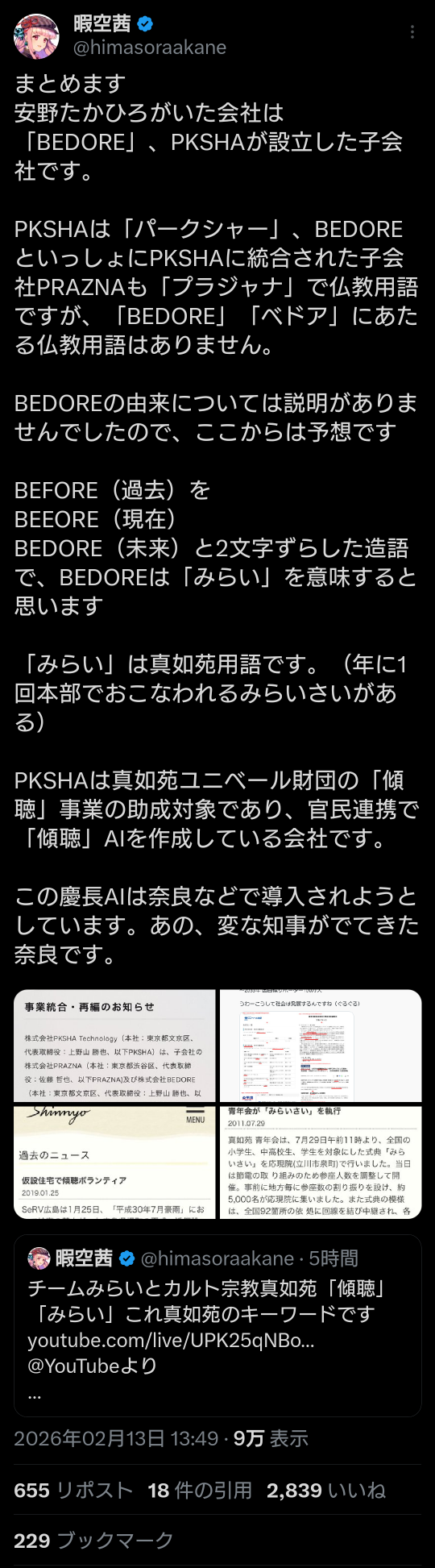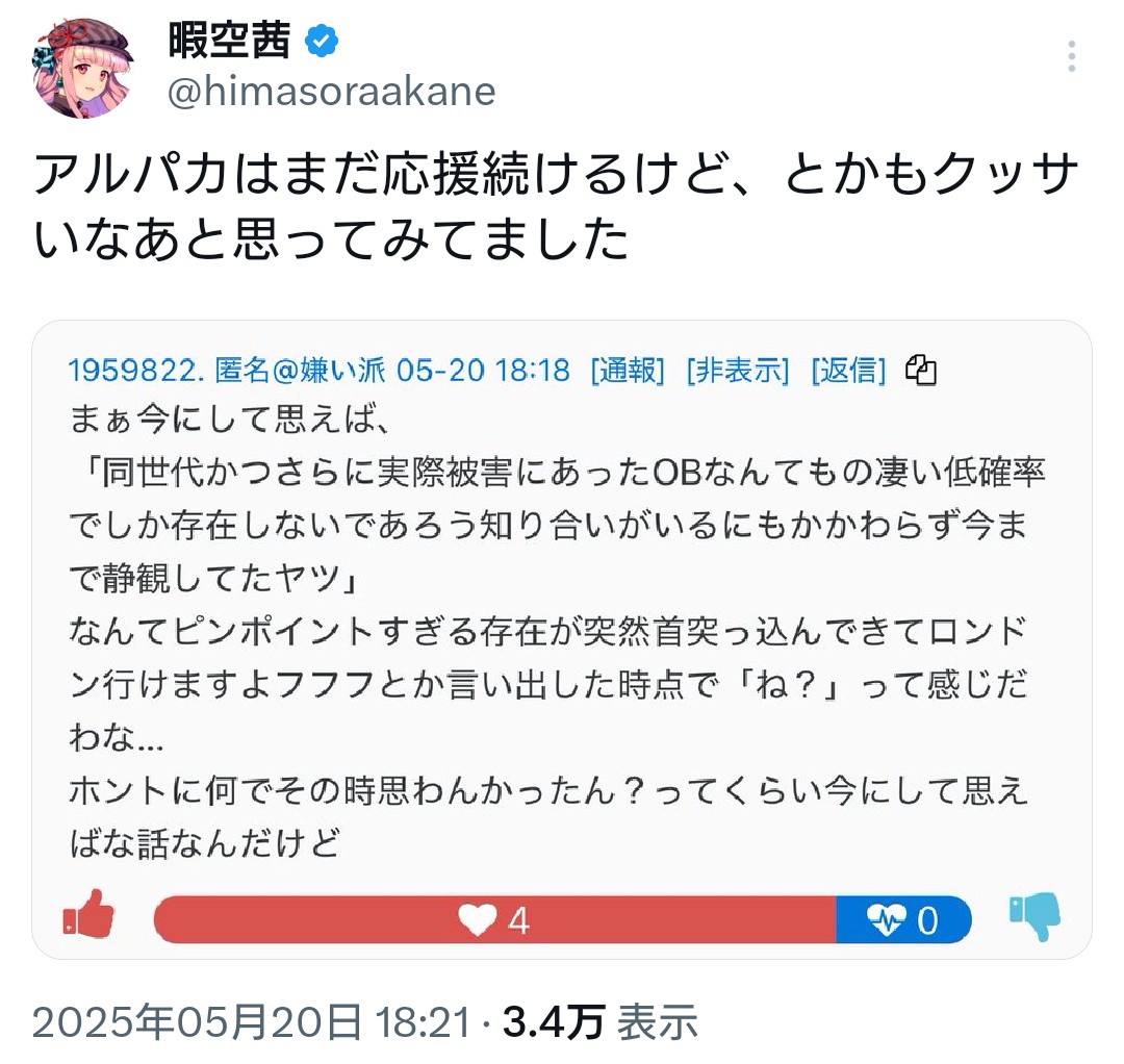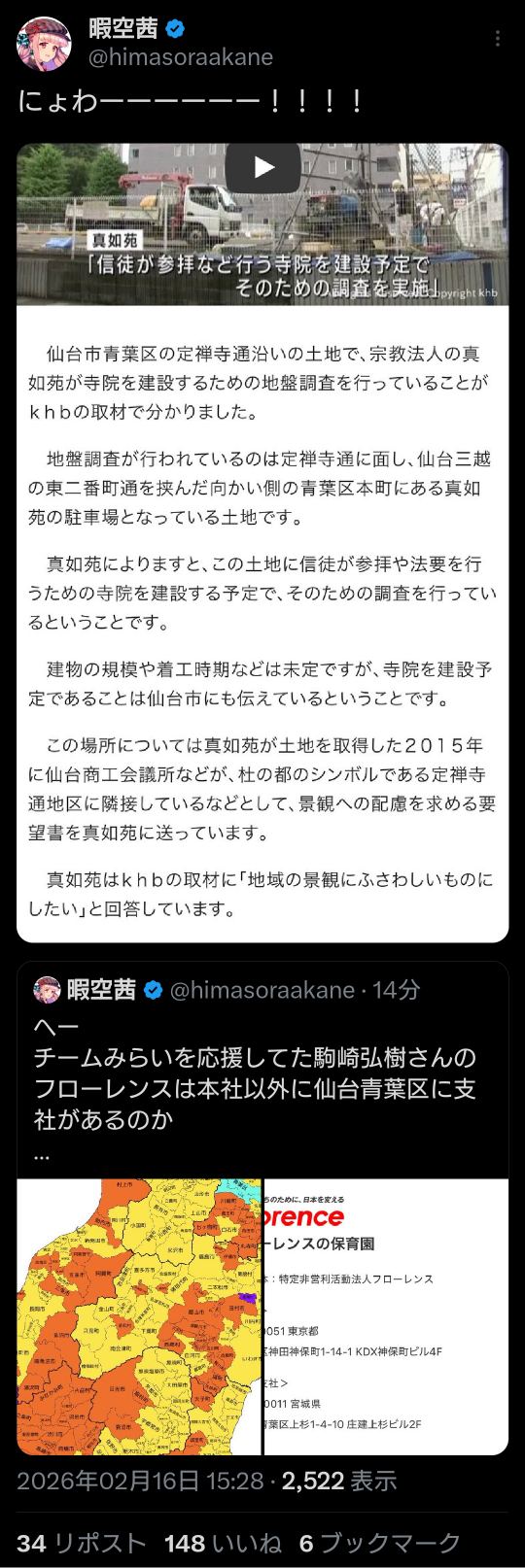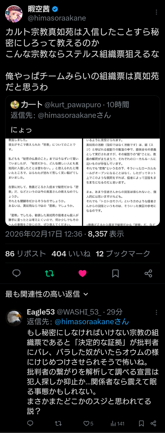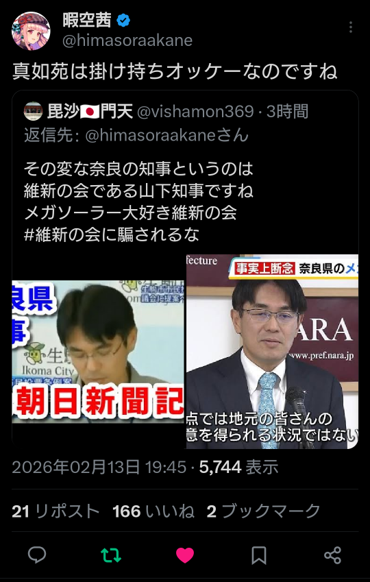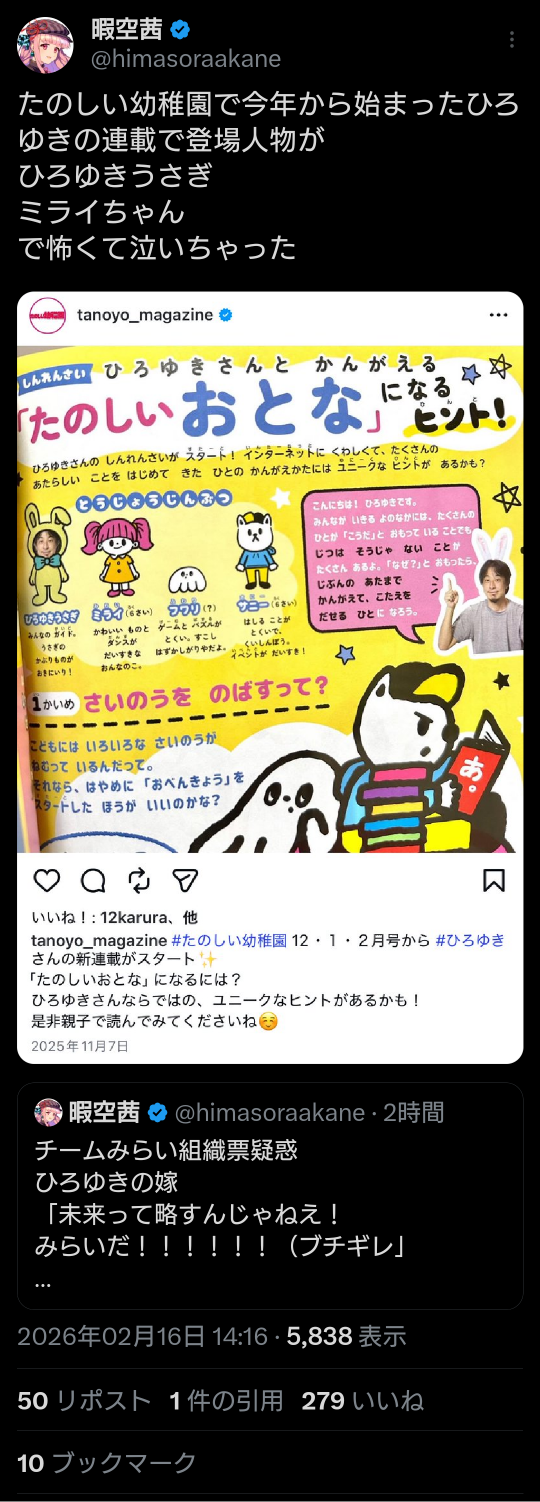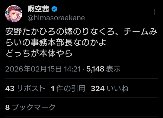 | … | 959無題Name名無し 26/02/17(火)14:48:06 IP:125.193.*(mesh.ad.jp)No.2698716そうだねx10>https://x.com/himasoraakane/status/2023602362477363478 |