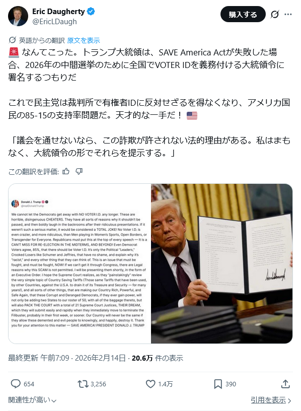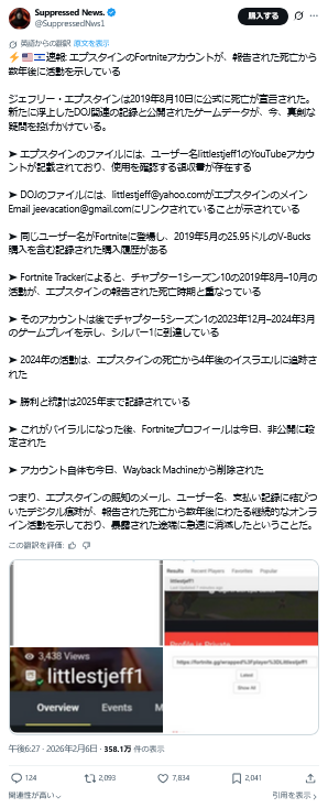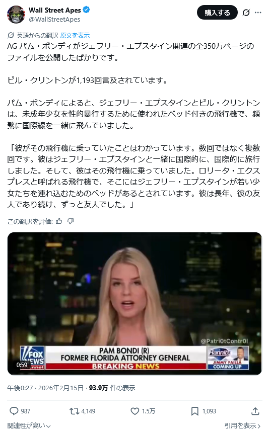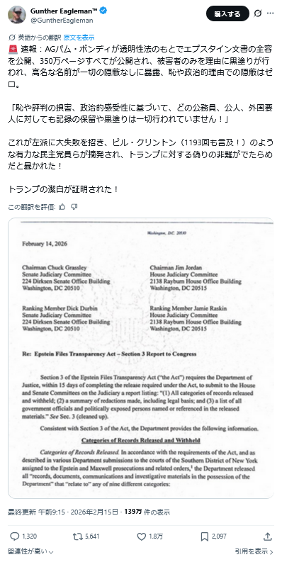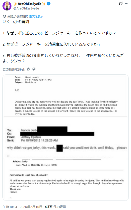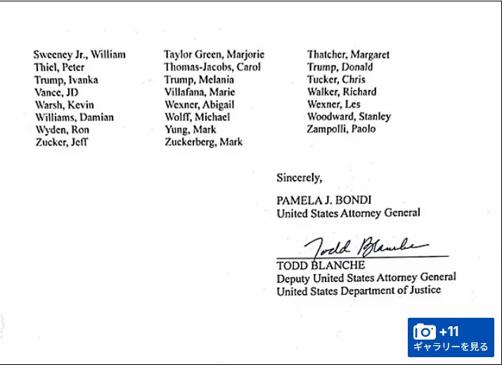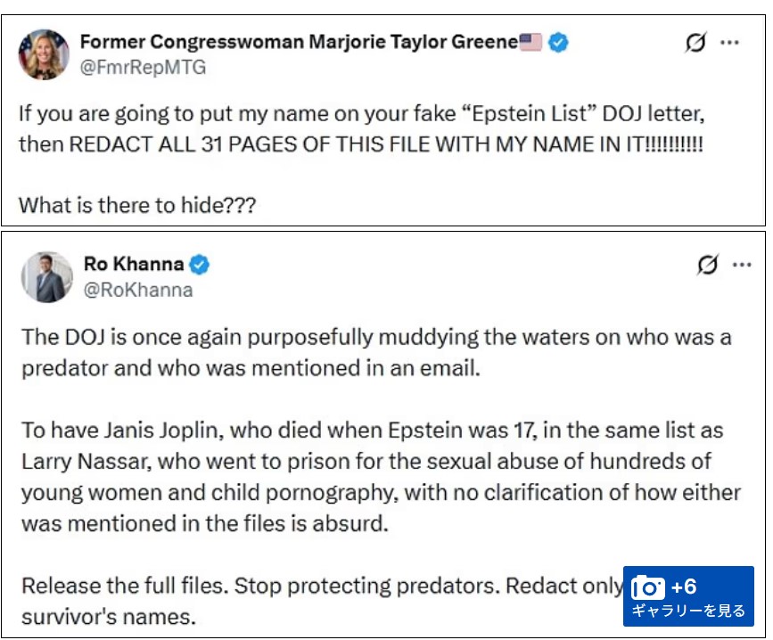 | … | 947無題Name名無し 26/02/17(火)13:31:04 IP:59.190.*(eonet.ne.jp)No.2698683そうだねx4>>文書開示の法的義務付けを主導した野党・民主党のロー・カンナ下院議員は300万ページが非公開のままだと主張し、「完全なファイルを公開せよ。(女性の)捕食者を守るのをやめろ」と政権を批判している。 |