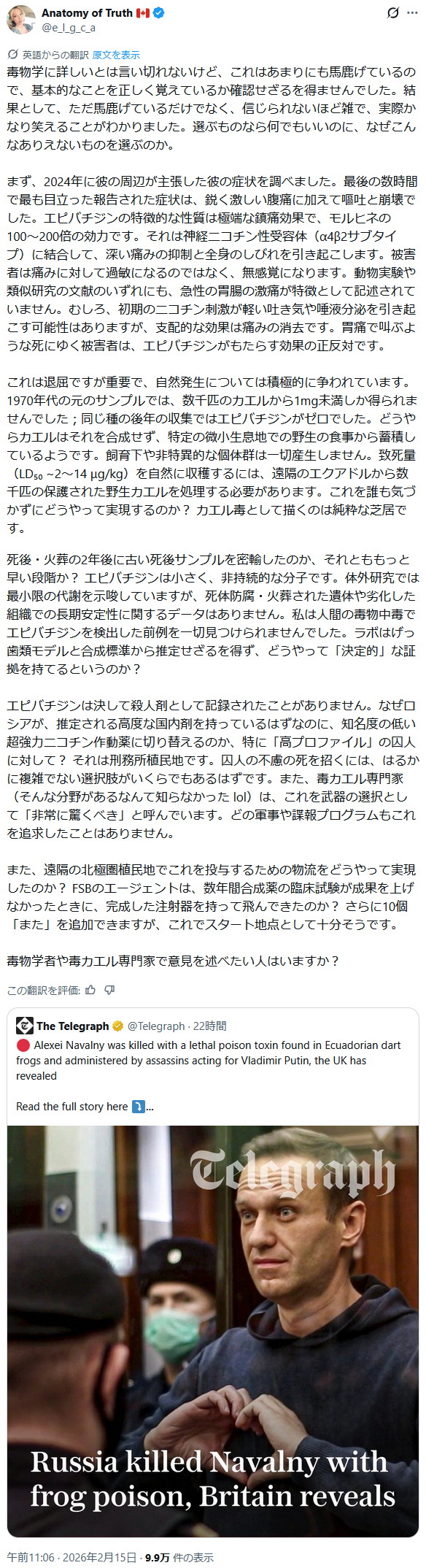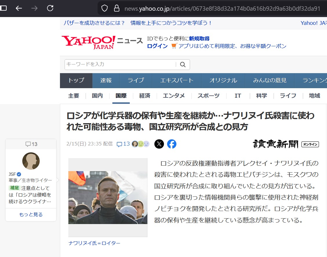 | … | 955無題Name名無し 26/02/17(火)14:17:14 IP:106.150.*(dion.ne.jp)No.2698703そうだねx3 1771305434538.png-(627920 B) ザハロワ姉貴がナワリヌイ毒殺報道とエプ報道の関係についてひとこと |