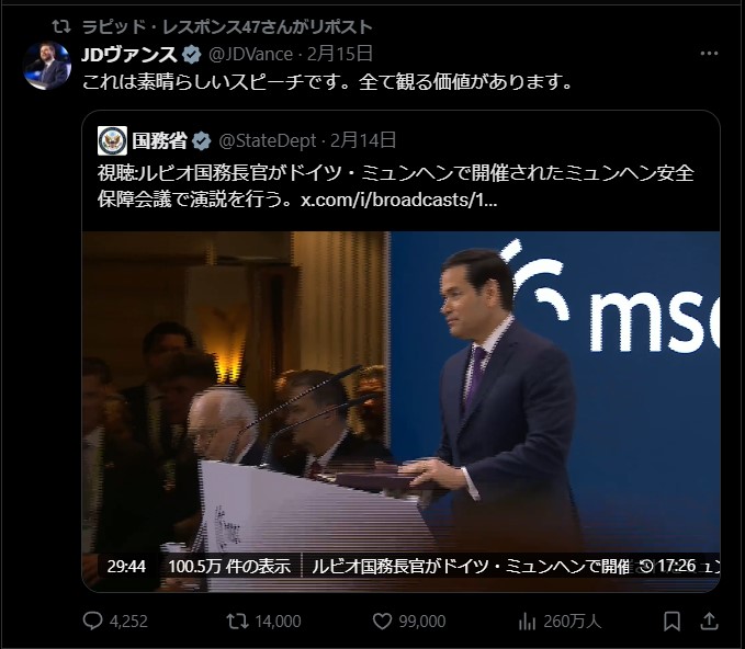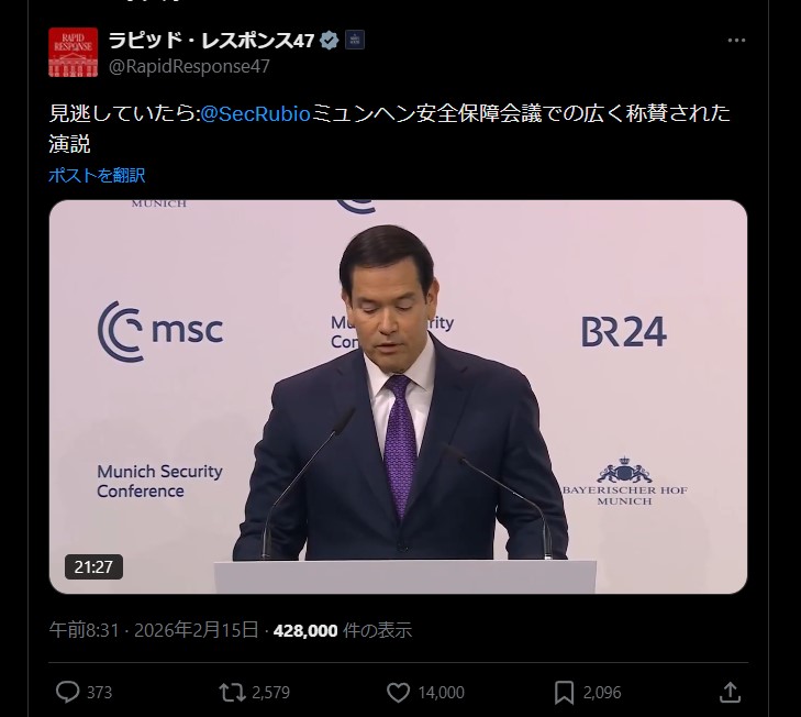 | … | 961無題Name名無し 26/02/17(火)14:58:45 IP:106.150.*(dion.ne.jp)No.2698720+ 1771307925101.jpg-(41969 B) 欧州委員会の歩く爆弾、カラス外交代表がミュンヘンで珍発言 |