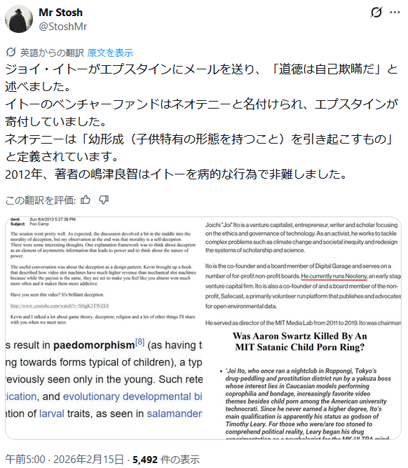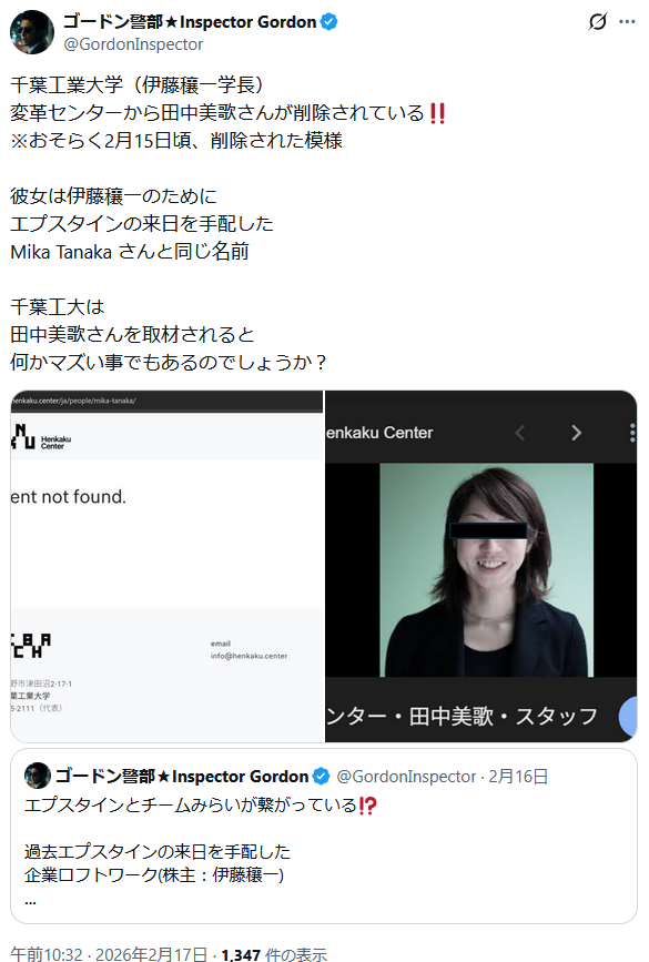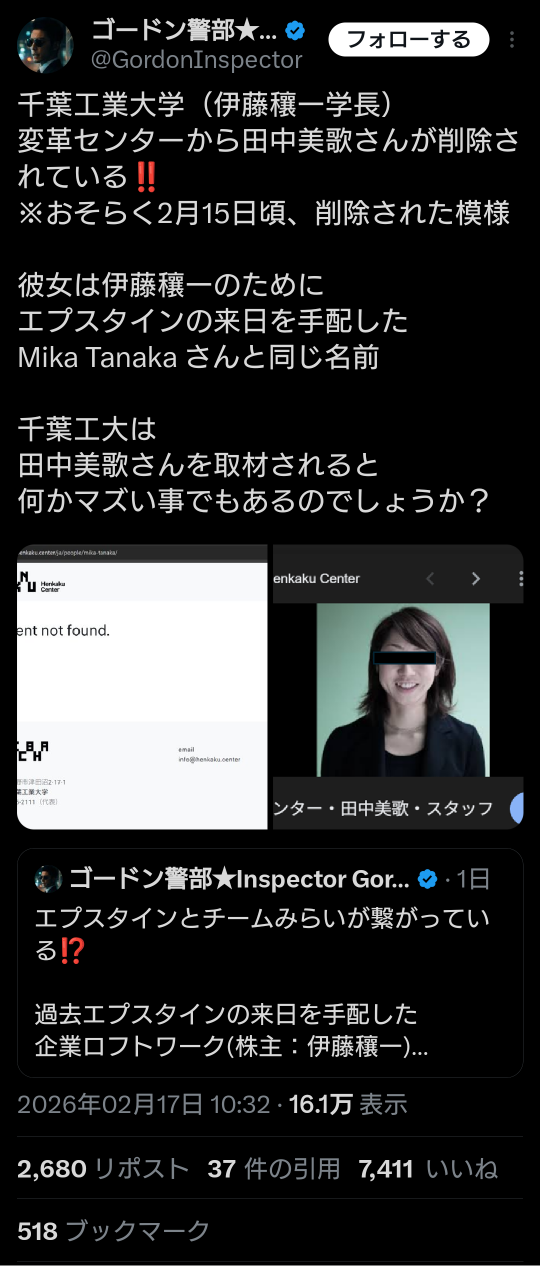 | … | 915無題Name名無し 26/02/17(火)11:35:53 IP:153.137.*(ocn.ne.jp)No.2698649そうだねx5 1771295753669.png-(900216 B) >伊藤穰一が学長をつとめる千葉工業大学の変革センターからエプスタインの来日を手配したとみられる田中美歌が削除されたよ |