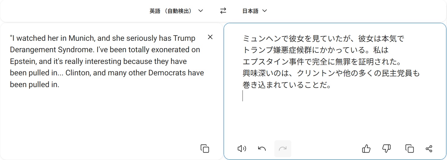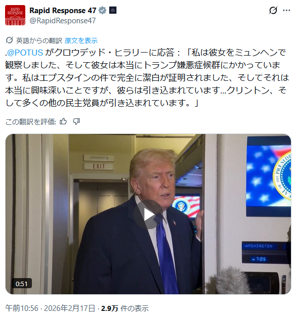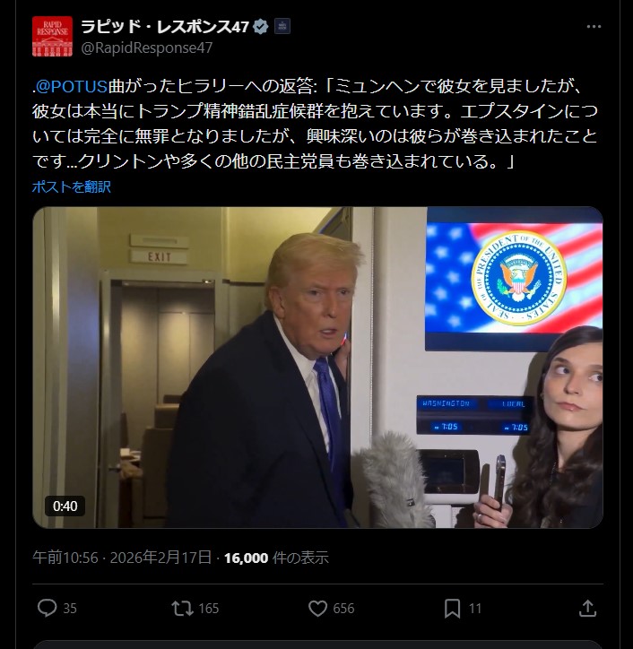 | … | 911無題Name名無し 26/02/17(火)11:26:21 IP:106.150.*(dion.ne.jp)No.2698645そうだねx3 1771295181582.jpg-(110856 B) ミュンヘンへ行ったヒラリーについてトランプ大統領がコメント |