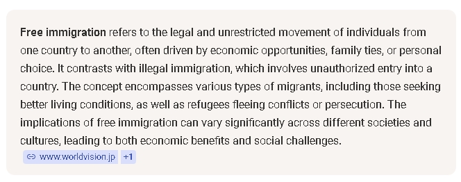 | … | 1free immigrationの意味Name名無し 26/02/13(金)14:03:30 IP:1.73.*(spmode.ne.jp)No.2697550+ 1770959010118.jpg-(83255 B) 自由移民とは、経済的機会、家族の絆、または個人の選択によって、個人が合法的かつ制限なく国から国へ移動することを指します。これは、不法入国を伴う不法移民とは対照的です。この概念には、より良い生活条件を求める人々や、紛争や迫害から逃れる難民など、様々なタイプの移民が含まれます。自由移民の影響は、社会や文化によって大きく異なり、経済的利益と社会的課題の両方につながります。 |