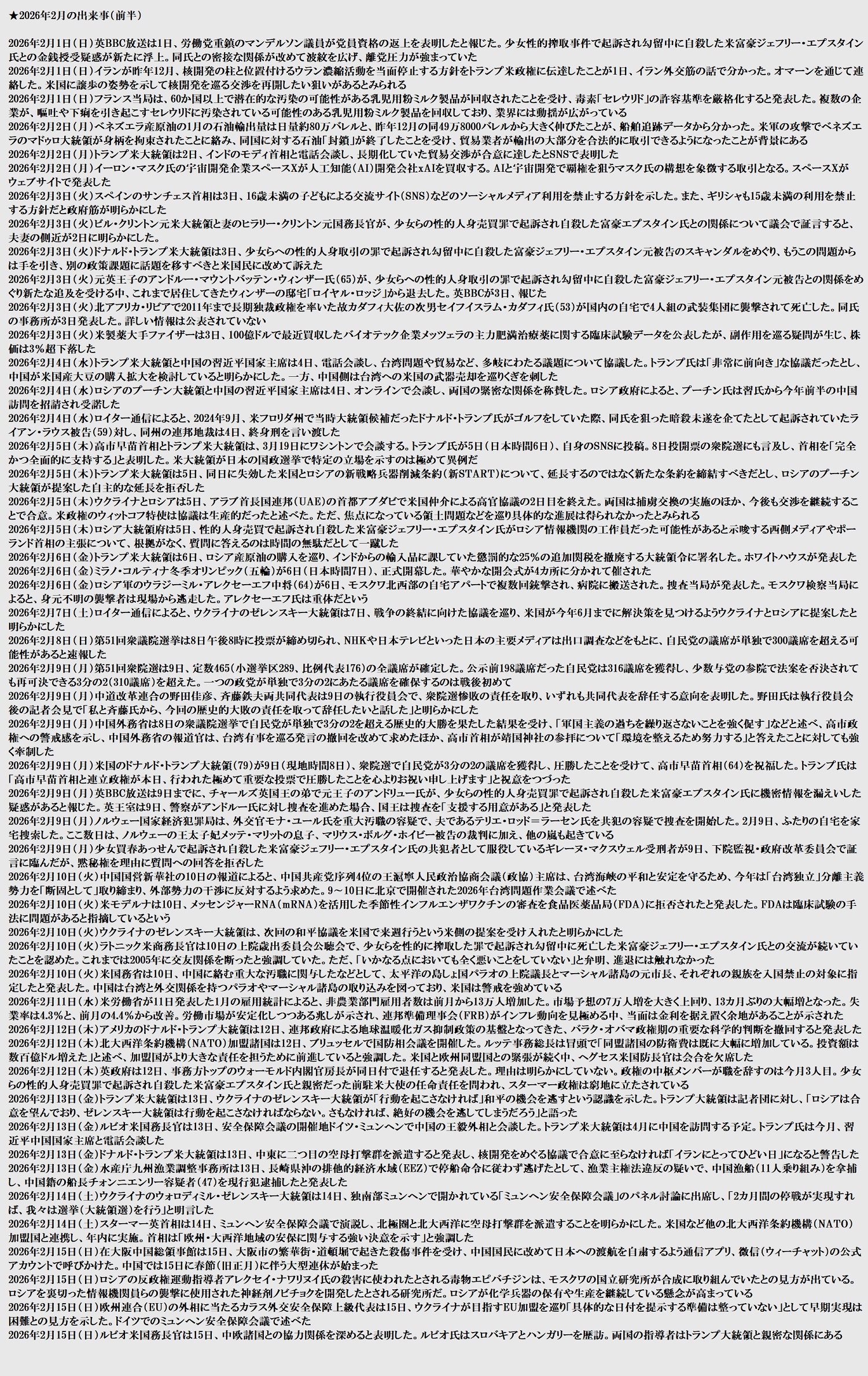 | … | 19無題Name名無し 26/02/23(月)21:19:00 IP:175.177.*(itscom.jp)No.2700545そうだねx1 1771849140214.jpg-(2378806 B) ★2026年2月(前半〜15日)出来事まとめ |