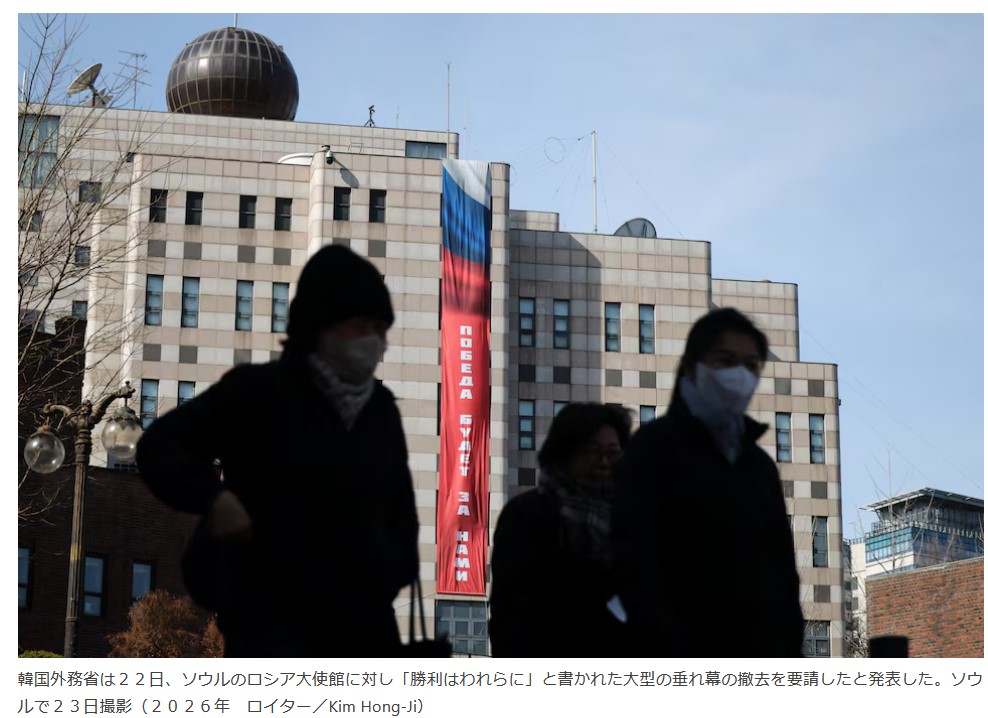 | … | 34無題Name名無し 26/02/23(月)21:48:04 IP:106.150.*(dion.ne.jp)No.2700563そうだねx4 1771850884483.jpg-(136259 B) ソウルのロシア大使館に「勝利」の巨大垂れ幕、韓国が撤去要請も応じず |
