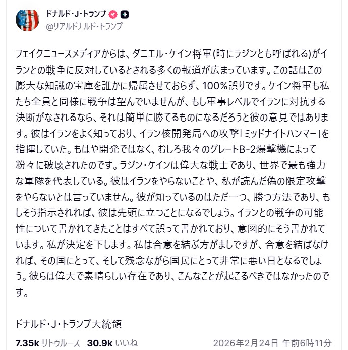 | … | 114無題Name名無し 26/02/24(火)09:26:40 IP:106.150.*(dion.ne.jp)No.2700660+ 1771892800774.jpg-(165496 B) 米軍制服組トップ「イラン攻撃なら紛争長期化」 トランプ氏に助言か ワシントン=坂口幸裕 |
