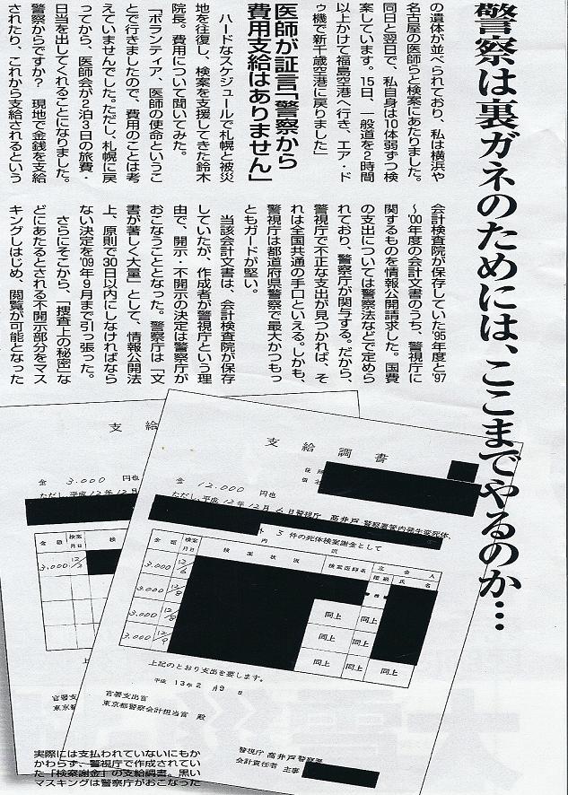 この記事を書いたのは、本紙でもお馴染みのジャーナリスト仲間の寺澤有氏だ。以前から、記者クラブ制度の問題もそうだが、警察の裏ガネ作りについても精力的に取材している。寺澤氏は6年以上前、会計検査院に警視庁会計文書について情報公開請求し、入手した約38万枚を分析。その過程で検案における裏ガネ作りの可能性に気づいていたが、被災地を取材した際、実際に検案した医師の証言を得ることができ、今回のスクープに結実した。(1/2)