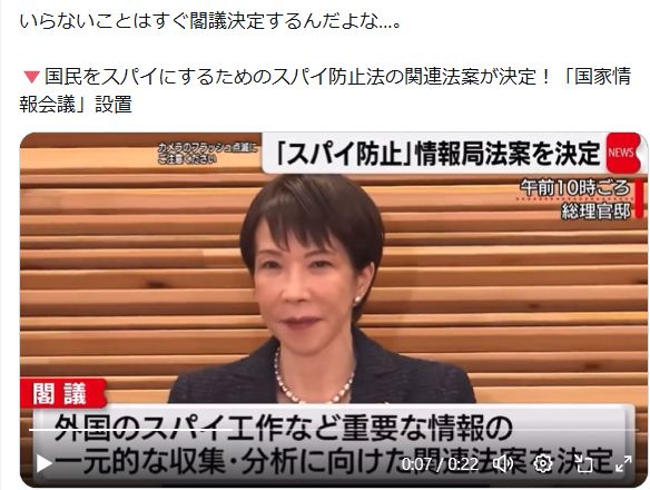 DSと高市朝鮮カルト統一教会裏社会にとって、煩い人士等の口を封じる法案閣議決定。